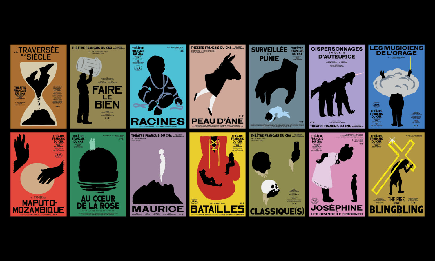 The NAC French Theatre’s 2024-2025 season is an invitation to get out not only of the house, but also of the frames that immobilize us. This new campaign is inspired by the work of the Beggarstaff brothers of the late 19th century, paying homage to the aesthetics of period posters. The posters feature illustrations by Gérard Dubois in the form of almost iconographic blobs, giving free rein to the imagination and using a restricted palette of two or three tones. The typography, minimalist and crude, reinforces this nostalgic visual approach. By combining tradition and modernity, the campaign offers a perspective that is both timeless and contemporary.