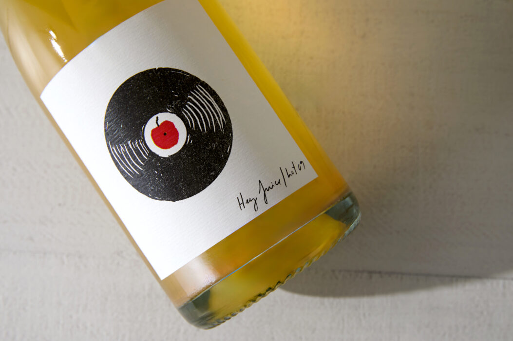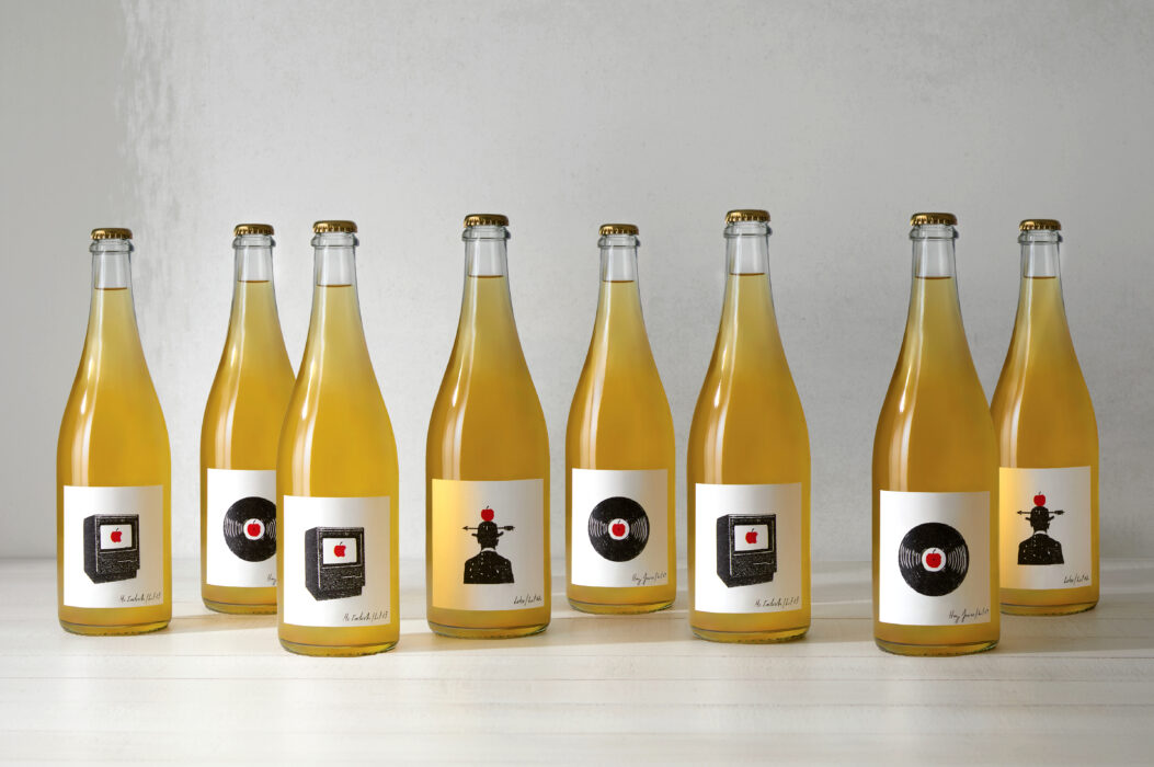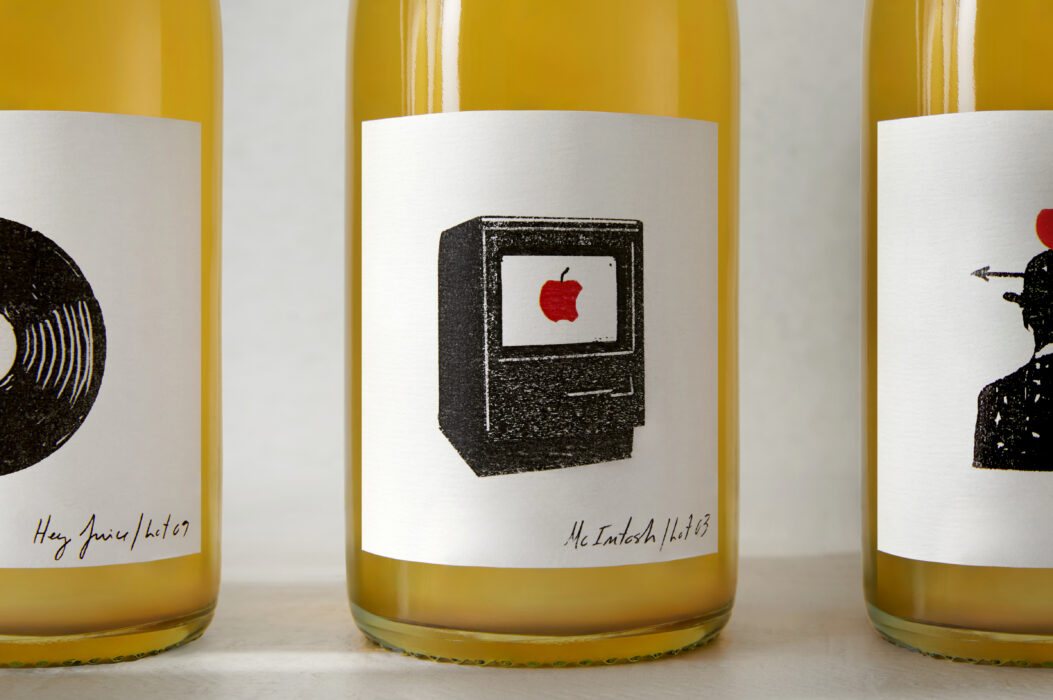 McIntosh, that unadulterated natural sparkle, presents the label for the first-generation computer that made the revolution. Hey Juice offers a balanced cuvée: a classic that’s gone down in history like that old record you never tire of. Lobo, whose juices are blended and dosed with lime blossom honey, evokes Magritte, while Big Apple, slow-macerated with natural yeast and dosed with maple syrup, evokes the inescapable city. A label program that spares no distraction and presents a sober, elegant canvas, giving full rein to the black illustrations, finished off with the apple in red ink.