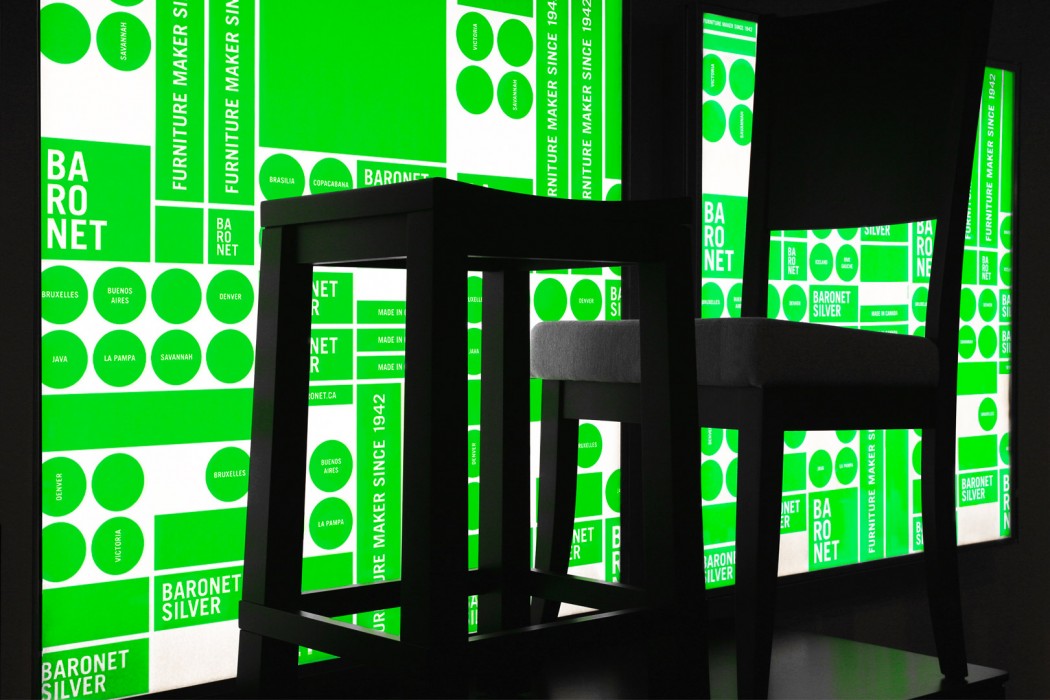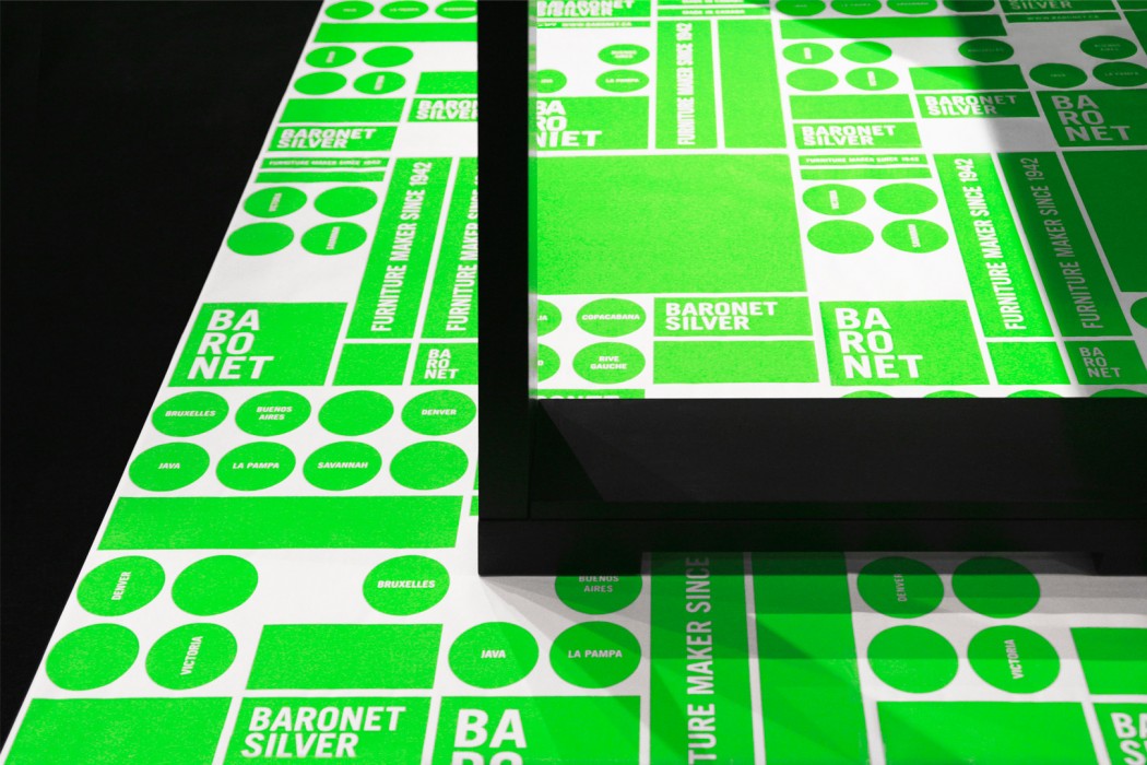 Baronet is a high-end furniture manufacturer which commissioned Paprika to design its showroom “Green” in the fall of 2007. To achieve this mandate, we made a green fluorescent poster which we juxtaposed many times to cover the showroom’s walls. The poster became the focal point of the space’s interior design and was often transformed to create wrapping paper and the event’s invitation.