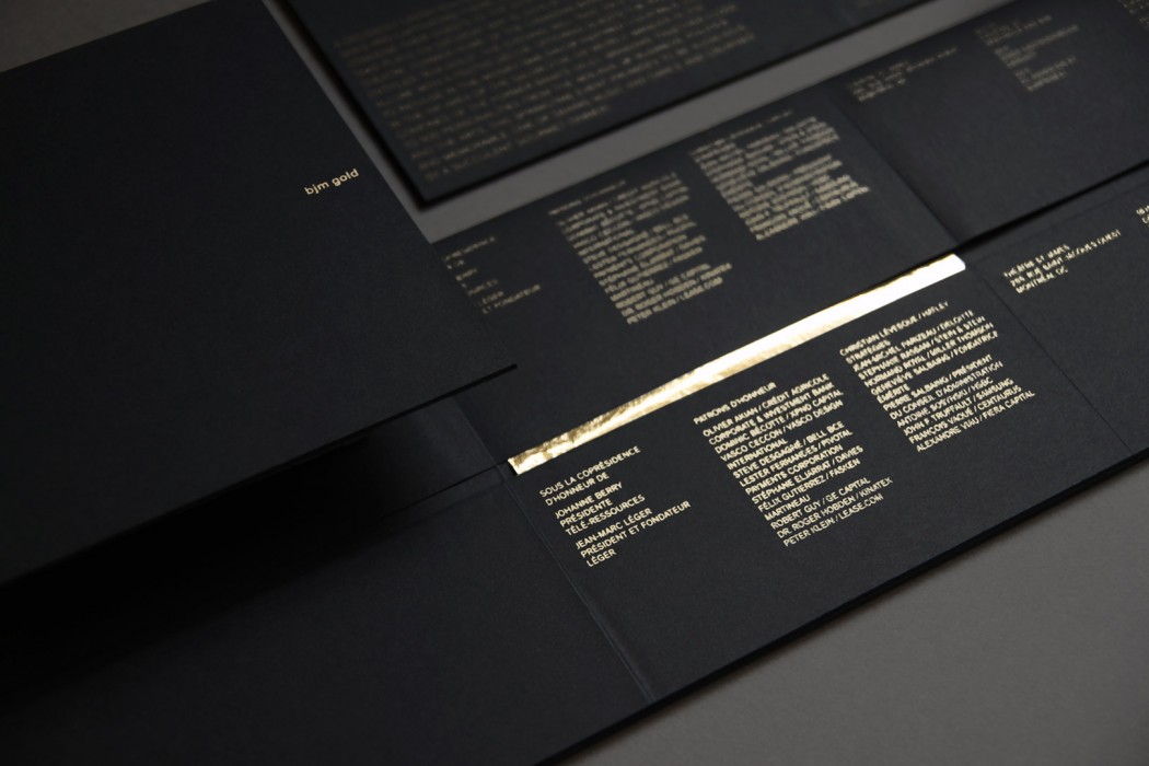 We drew inspiration from the glamourous atmosphere surrounding the event and made a typographic invitation that was printed in gold ink on black cardboard. We also placed a gold leaf on each invitation. This rich color symbolizes the unique night’s elegant and refined nature.