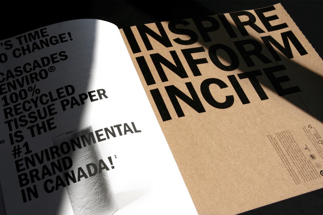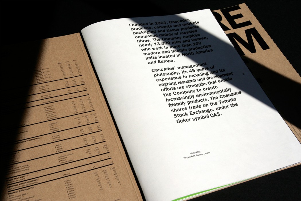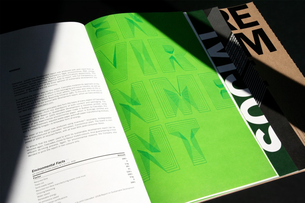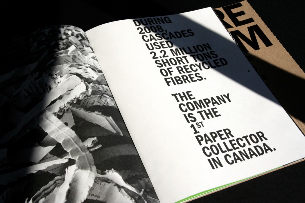 Cascades is specialized in the manufacturing, transformation, and commercialization of recycled fibre products. In 2008, the company appealed to Paprika to design a sustainable development plan which would illustrate its environmental preoccupations both in form and content.