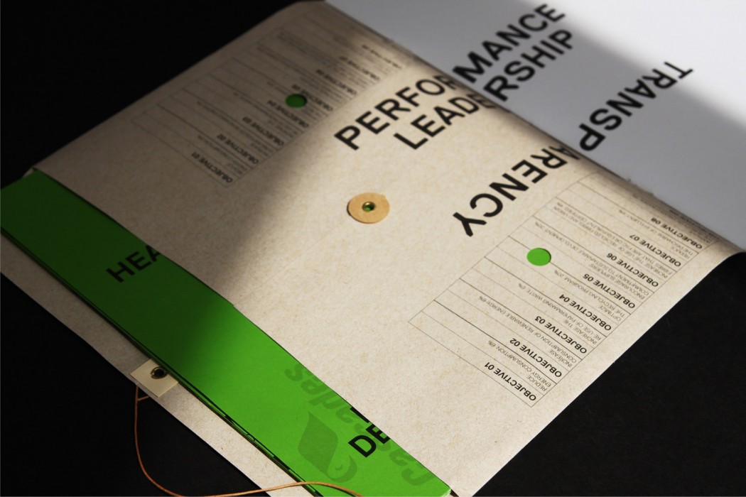 We made a document from entirely recycled materials. We also transformed the cover in a typical “inter-department” envelope, thus making it possible for Cascades to mail the report without having to resort to additional packaging.