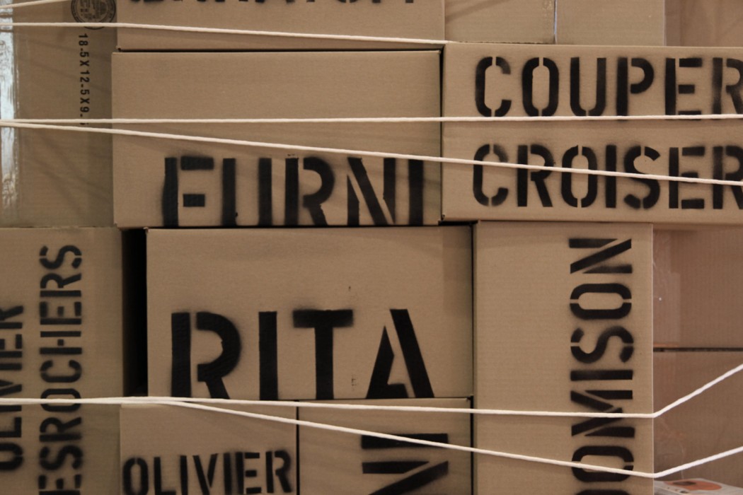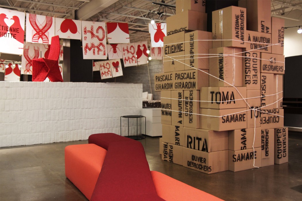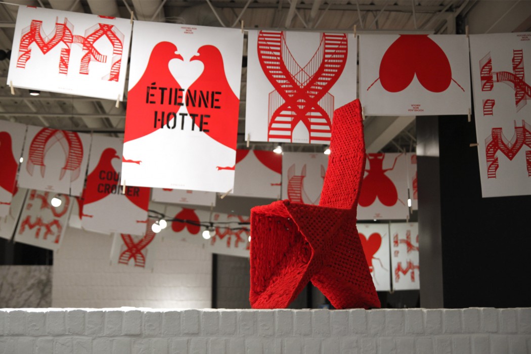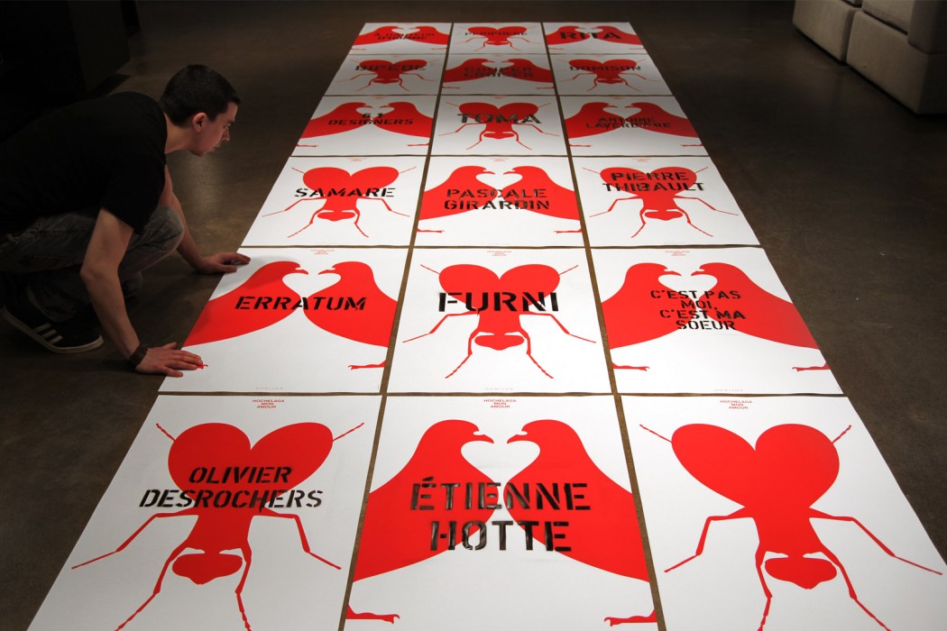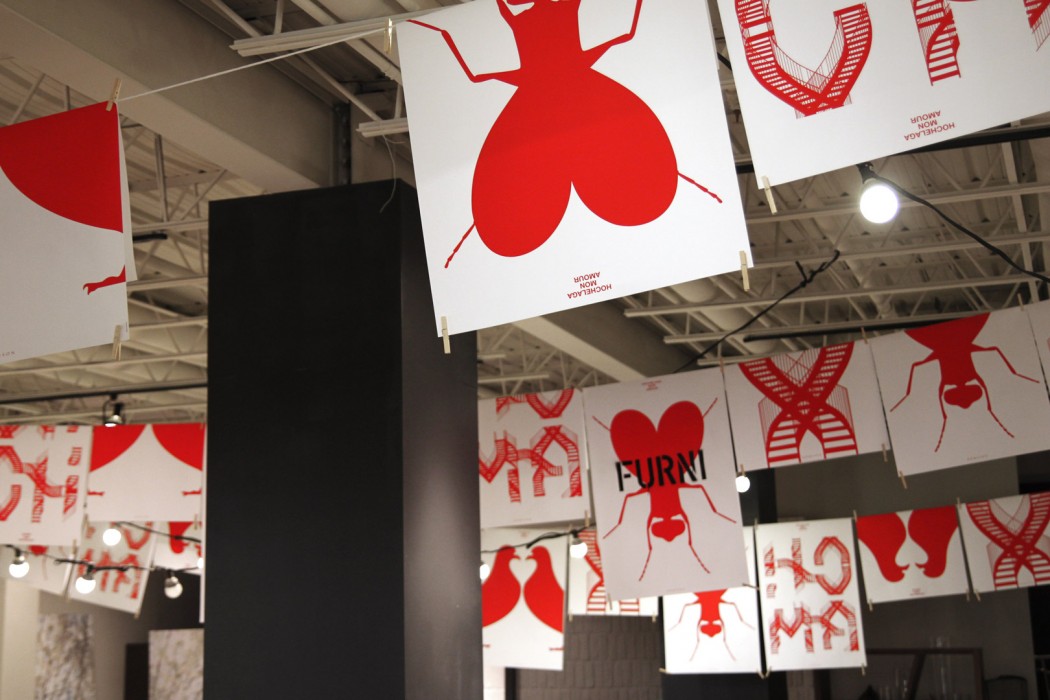 Domison is a furniture manufacturer whose philosophy is to offer sophisticated, unique, and innovative goods within the reach of most wallets. According to Domison, quality design is a right rather than a privilege. Invited to design the exhibition “Hochelaga mon amour”, Paprika created four posters representing symbols that characterize this less affluent neighborhood of Montreal: the pigeon, the fly, and the spiral staircase. This architectural aspect even inspired us an original typography made up of interlaced staircases. Silk-screened in red ink, the posters were suspended in store from clotheslines so that they could recall Hochelaga’s back alleys. Using stencils we also tagged a few posters to identify the work of the exhibiting artists. Moreover, tall box structures on which was written each present designer’s name were erected here and there.