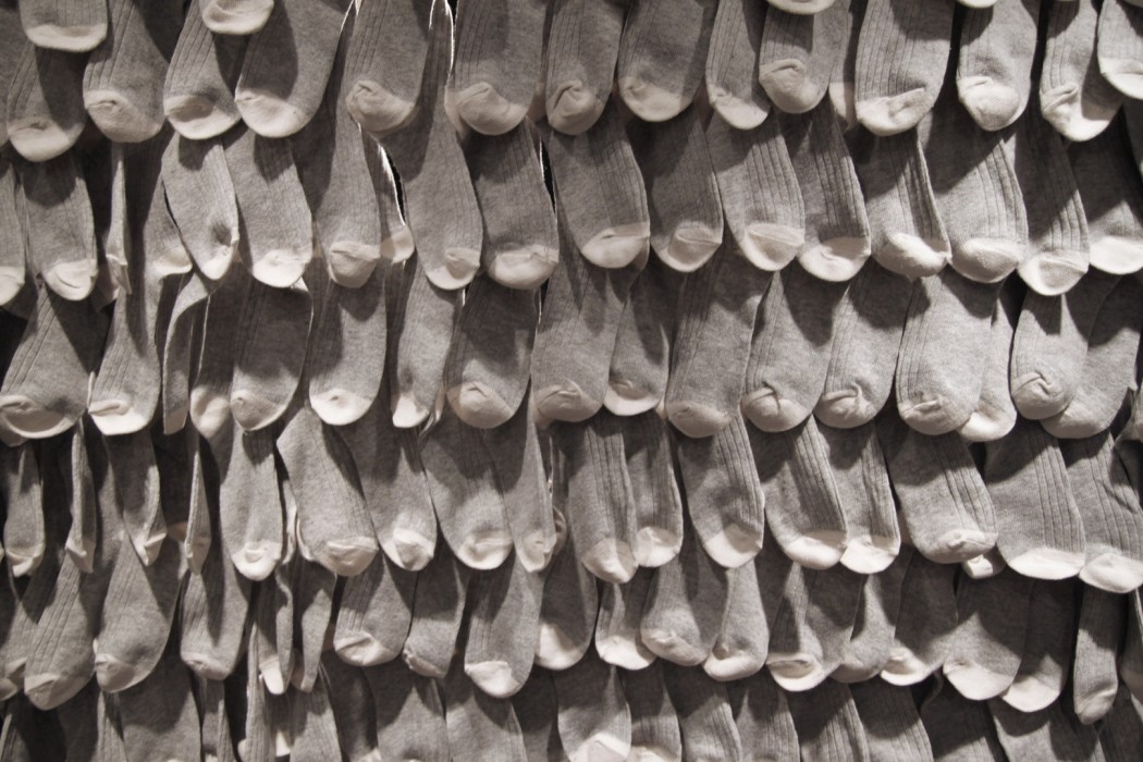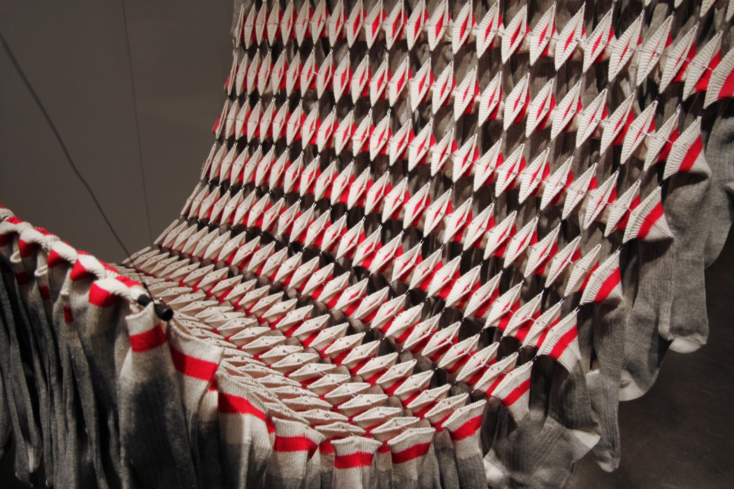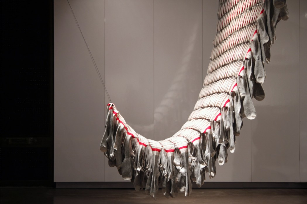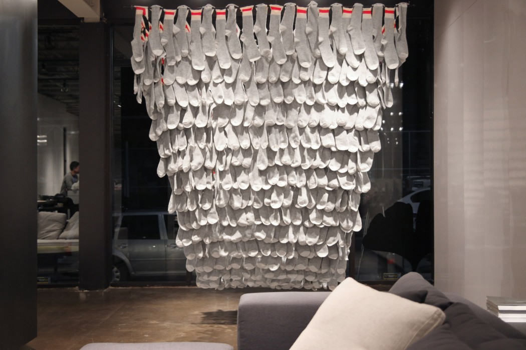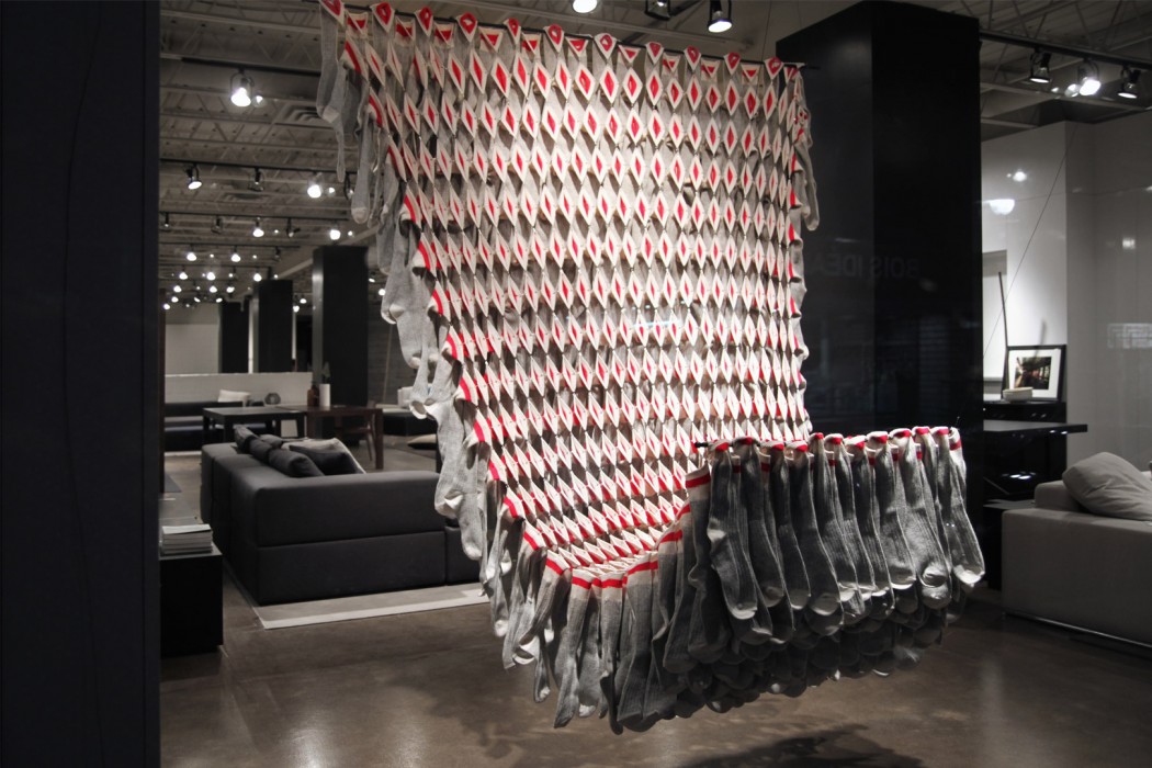 Domison is a furniture manufacturer whose philosophy is to offer sophisticated, unique, and innovative goods within the reach of most wallets. According to Domison, quality design is a right rather than a privilege. For a third consecutive year, Paprika made the window display of their Montreal boutique. Once again, we challenged ourselves with a bold installation that would only use objects of everyday life. The traditional grey wool sock was 2010’s lucky winner! With the help of safety pins, more than 600 wool socks were gathered together to create a loose and incredible sculpture hanging from the store’s ceiling. In line with every one of the installations created for Domison, we wanted to use recycling and/or reusable materials. Once undone, the surprising hammock thus kept 399 homeless people’ feet warm in Montreal.