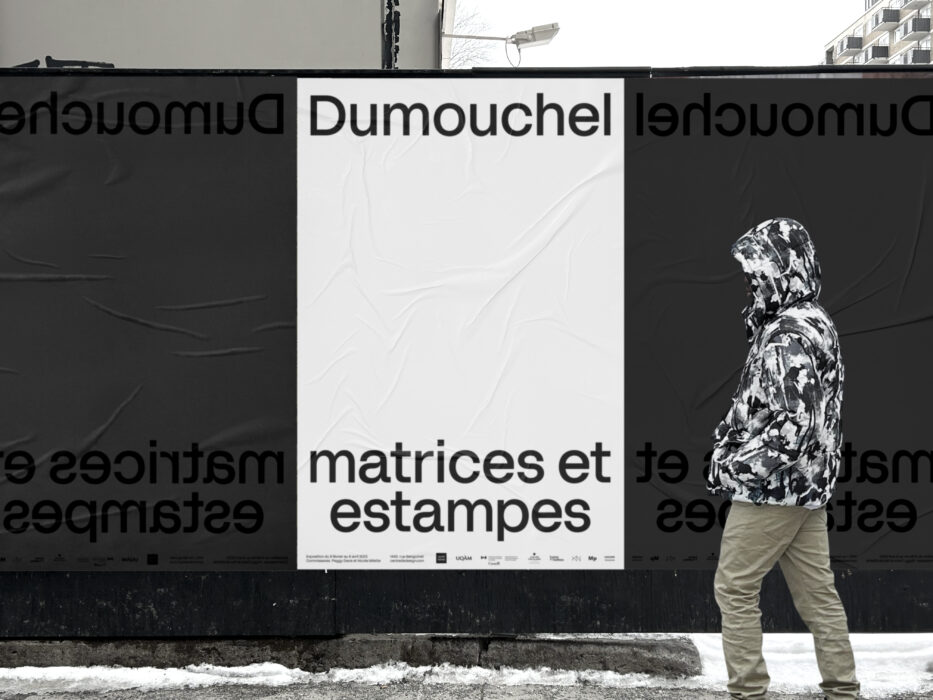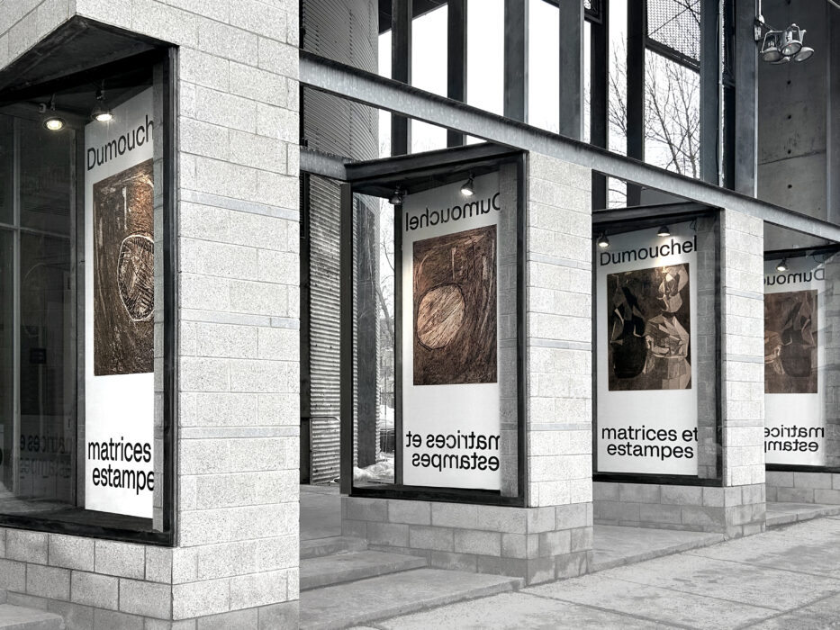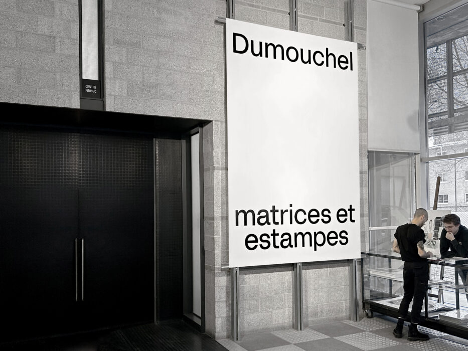 Dumouchel: matrices et estampes, an exhibition devoted to the key role played by matrices in the work of Albert Dumouchel (1916-1971), takes place at the Centre de design de l’UQAM this spring, thanks to the work of curators Peggy Davis and Nicole Milette. The presentation of some fifty matrices accompanied by prints consequently illustrates the approach of this experimental artist for whom creation was a perpetual research process. For this exhibition, a campaign and signage program was created, anchored in the printmaking technique. Taking as a point of pride the matrix and its resultant, the campaign unfolds a typographic game completed in posters, title wall and giant banners, all mounted on white or black canvas for a convincing otherness and impact.