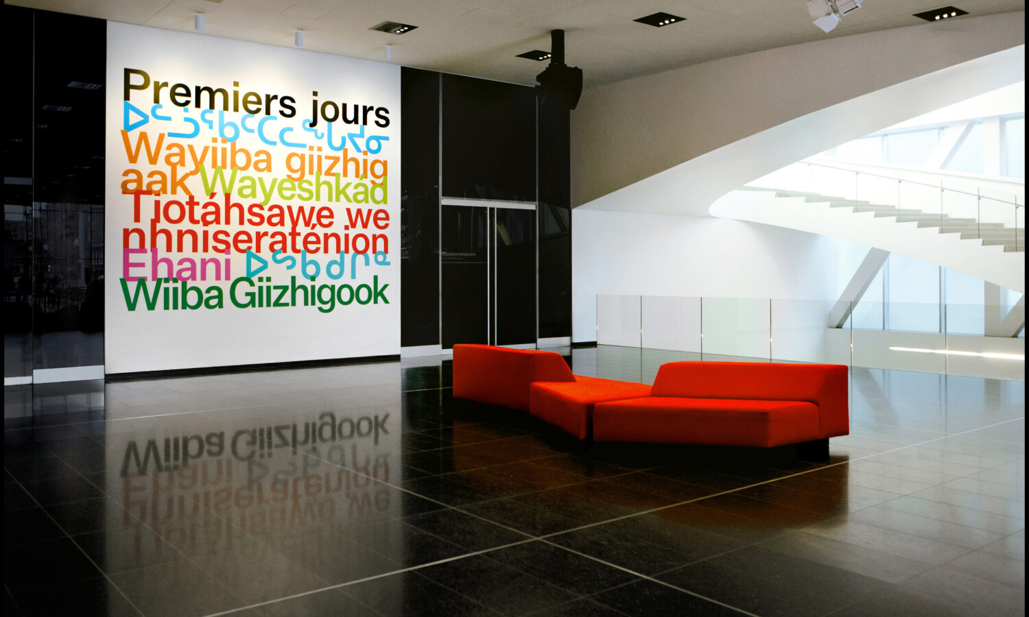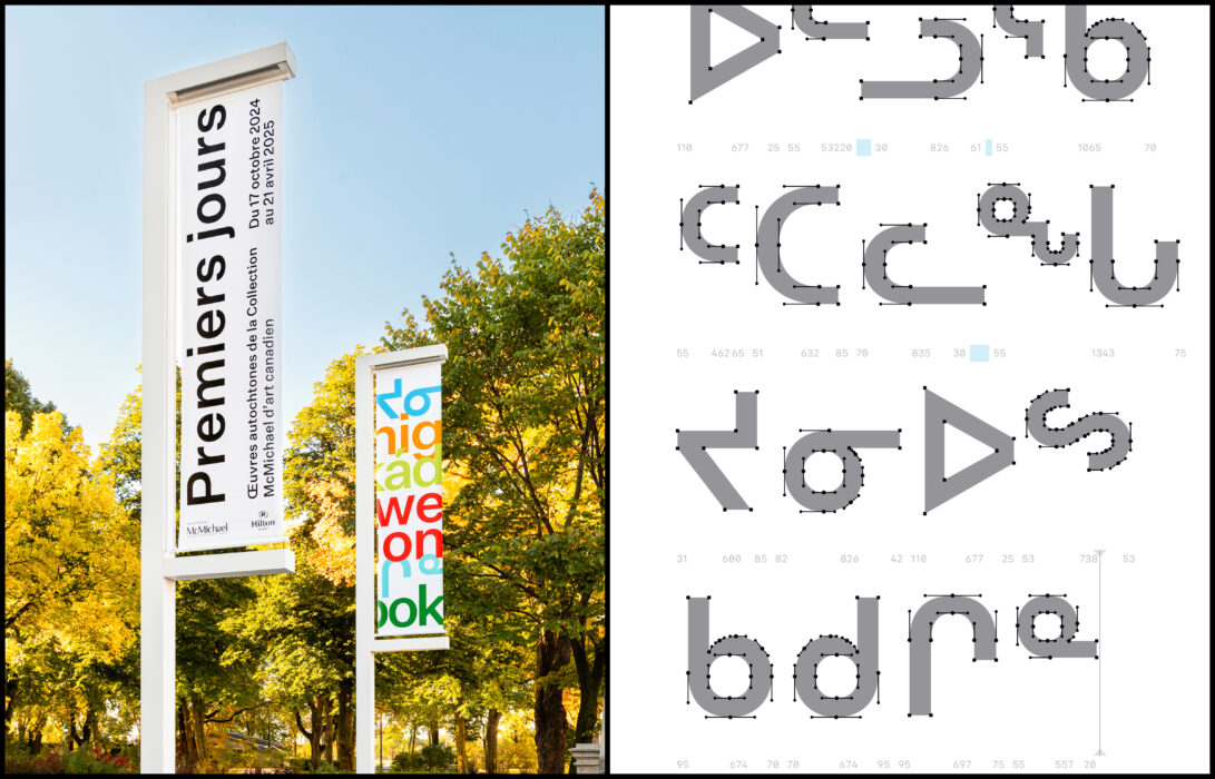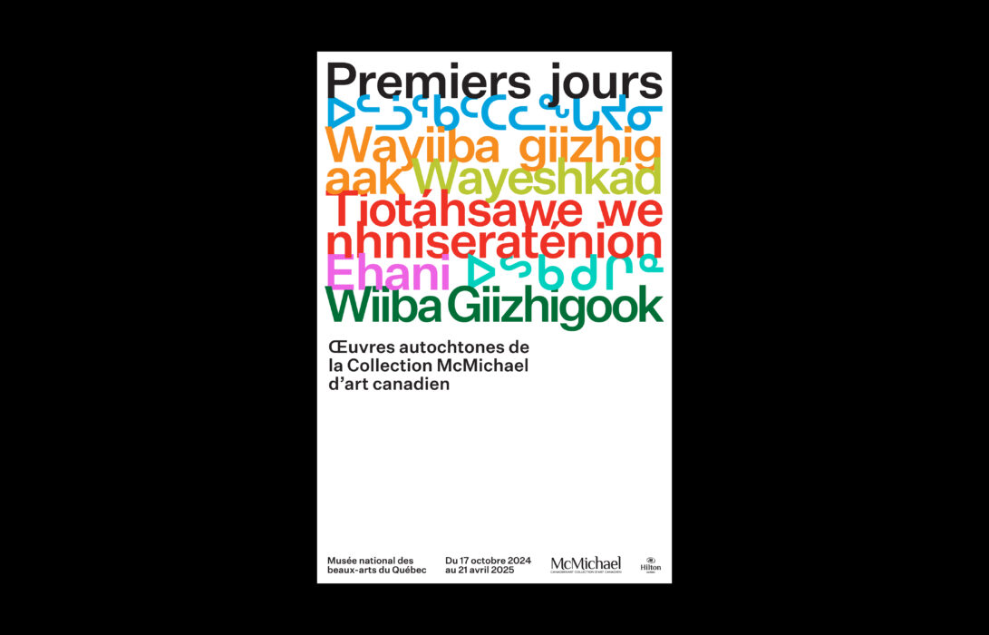 Paprika has signed the exhibition’s promotional campaign with a typographic block featuring the written languages of six of the indigenous communities taking part in the exhibition. Paying meticulous attention to the writing of these languages and their transposition onto white canvas, the proposal participates in the rewriting of First Nations history. The campaign features a selection of works from the exhibition’s extensive corpus, all set to music by legendary Inuk singer-songwriter and director Elisapie.