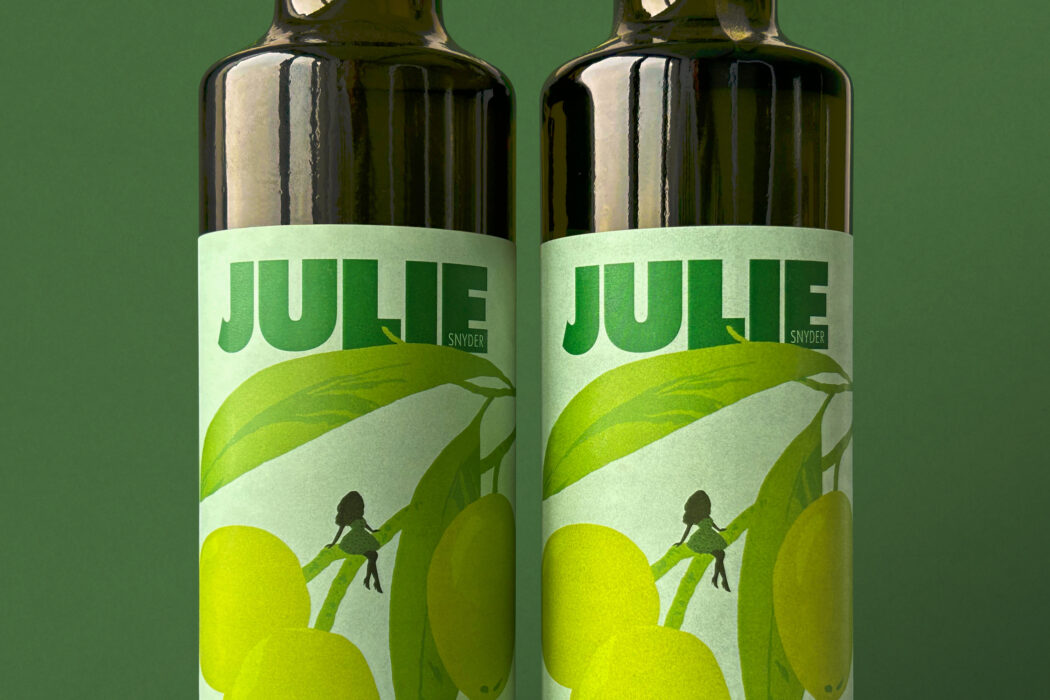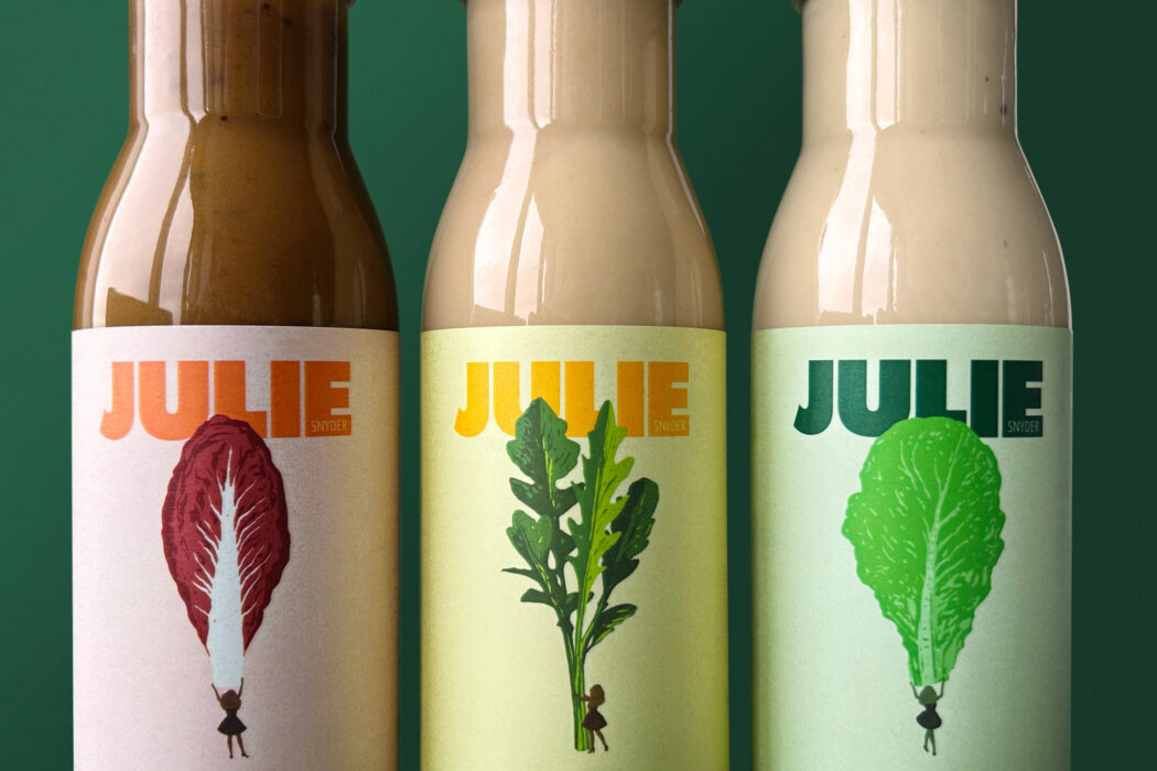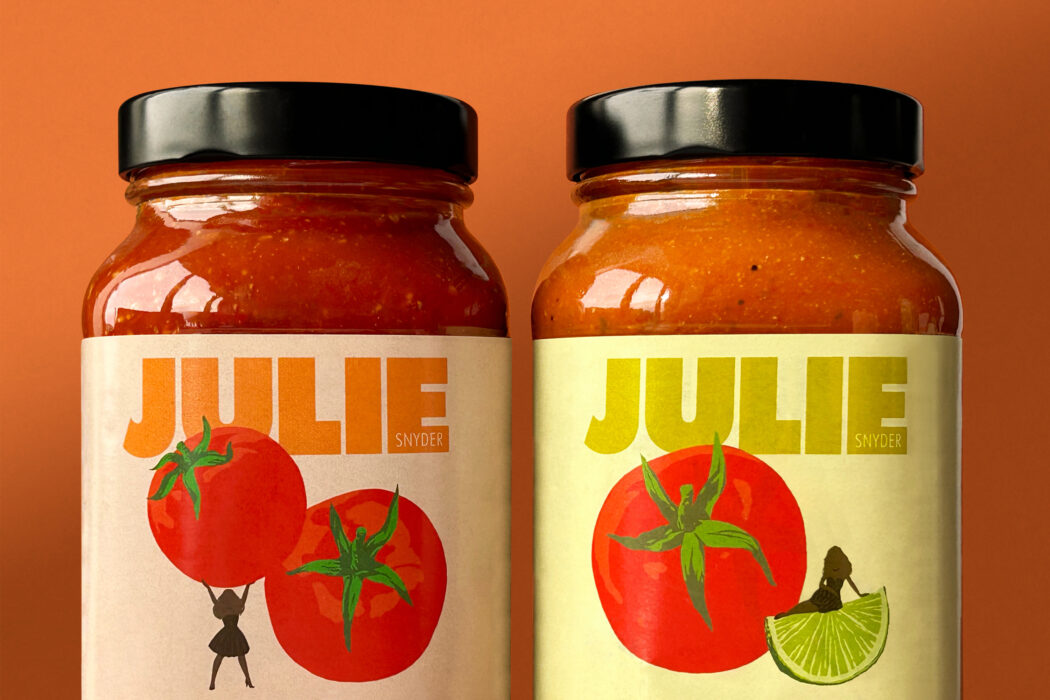 Julie Snyder, a television personality adored by the Quebec public, has created with business partners Amélie Léger and Marie-Pier Gaudreault a new line of authentic, unadorned foods with a local flavour. These little gourmet pleasures breathe quality and rally around Quebec know-how and its producers. A vegetarian since 1991, Julie Snyder has always been interested in food and offers these gourmet products with less sugar, more protein and always in vegetarian, sometimes even vegan, versions, a real innovative culinary immersion. For this range of products, an identity programme and packaging with fresh notes and a bright and vivid colour palette have been designed. Julie’s figure, petite and slender, wearing her iconic outfits, poses with fruits and vegetables of extraordinary sizes. Tomatoes, rocket salad, lettuce, almonds and olives share the limelight in playful compositions by the eminent illustrator Gérard Dubois.