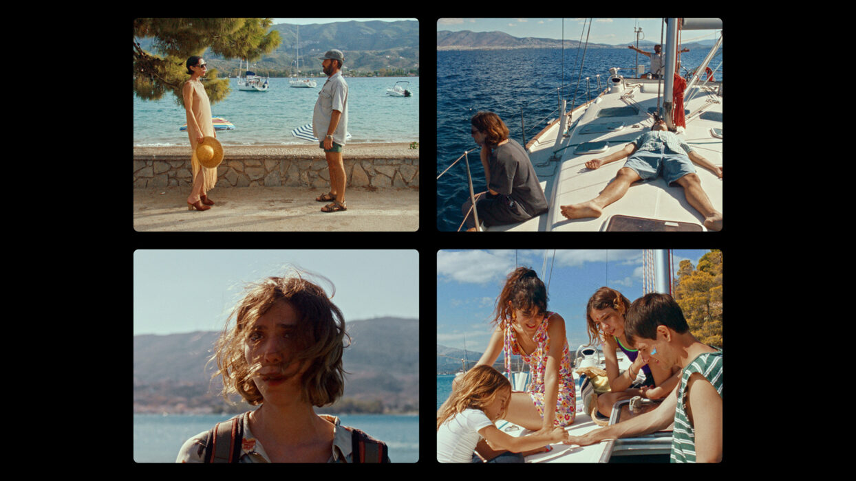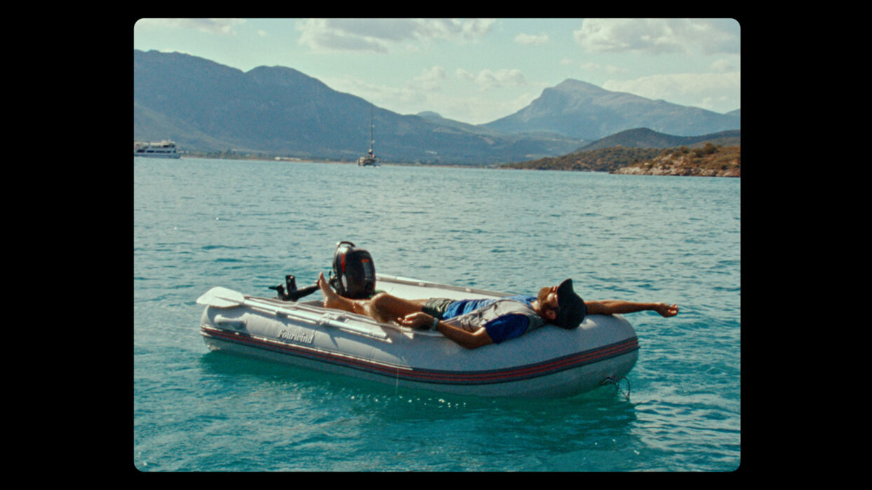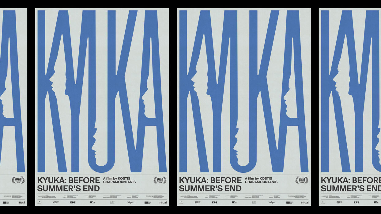 In KYUKA, a father and his twins share a sun-drenched summer on a remote island, where carefree days gradually give way to desire, melancholy, and the return of a long-buried secret. The poster reflects this tension through a minimalist typographic design: the towering letters of the title act as a frame for the silhouettes of the three characters. The twins look in the same direction but turn their backs to their father, symbolizing both their unity and the emotional distance that separates them. The blue tone evokes the sea and sky that shape the film’s bright yet fragile atmosphere. Through its simplicity and restraint, the design reveals the story’s underlying layer — beneath the glow of the holiday lies the quiet end of innocence.