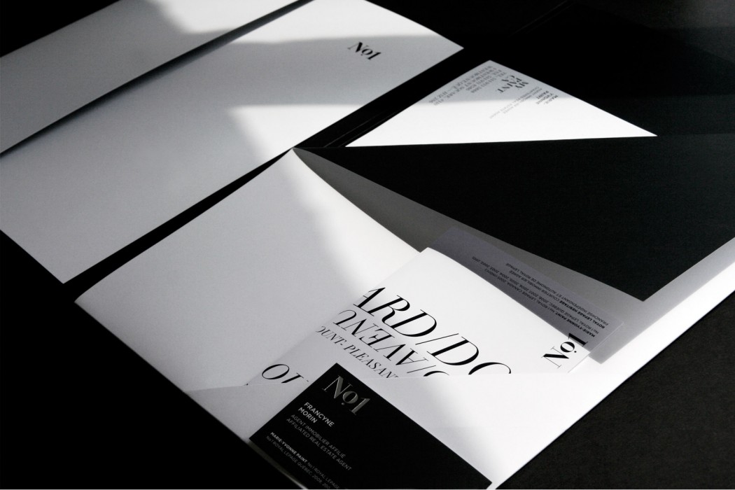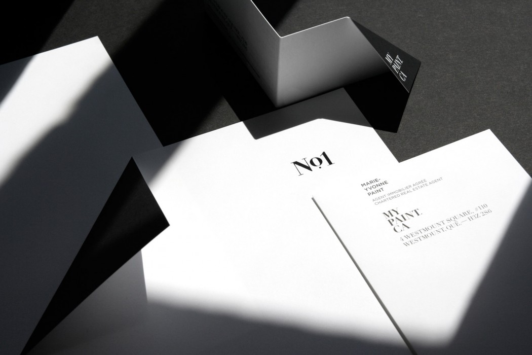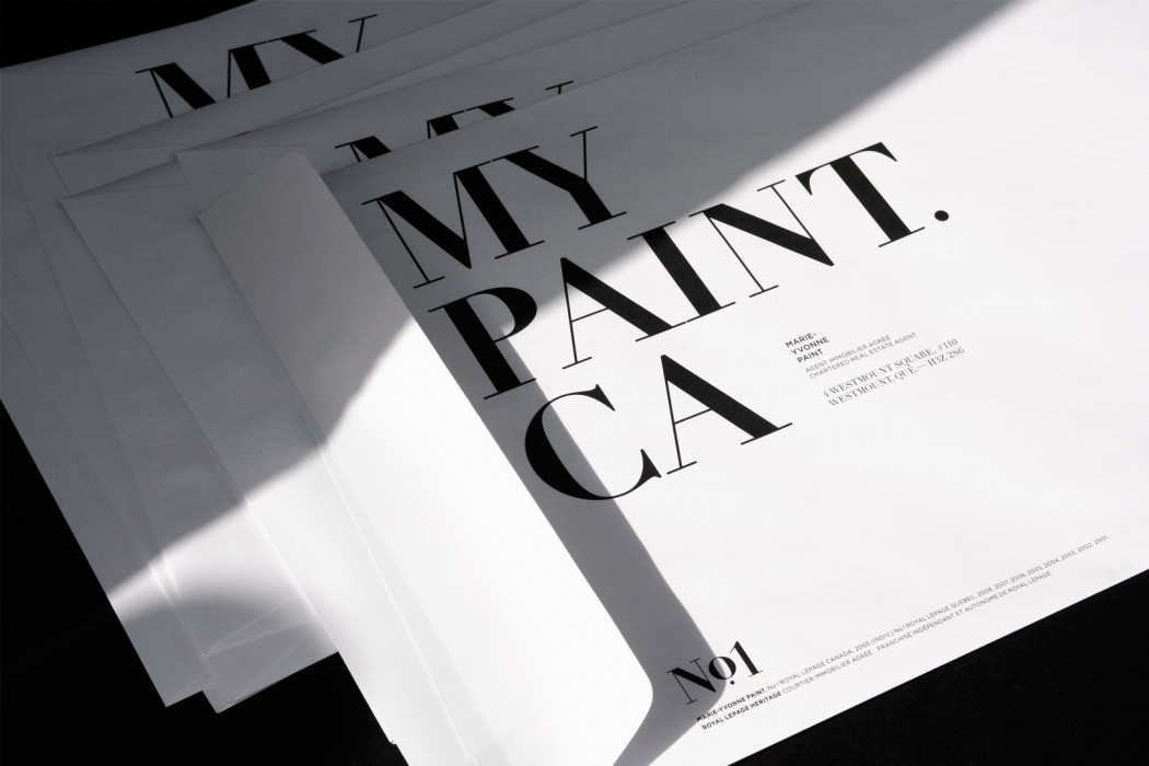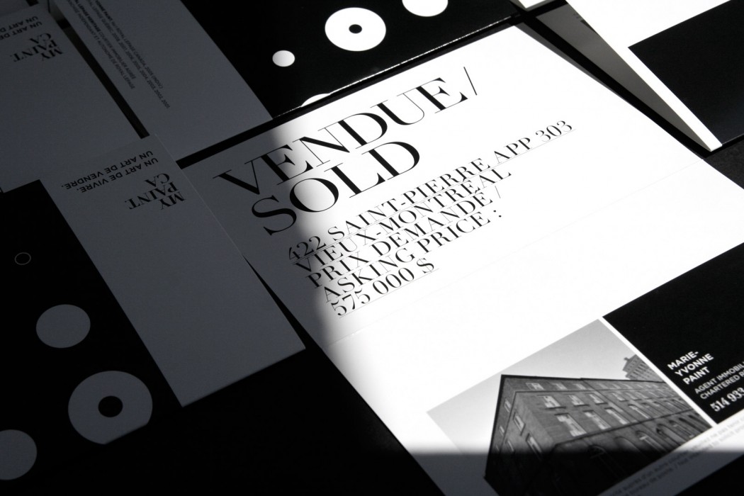 Marie-Yvonne Paint is the number one registered real estate agent in Montreal. Specialized in luxury homes and high-end condos, she wanted Paprika to review her identity programme to highlight such notoriety and sophistication. We believe that both the use of black and white and a classic serif typeface made a great fit for this distinguished programme. The fact that Marie-Yvonne is a leader in her field was not overlooked. Quite the opposite, it was key to her reviewed visual identity. Simple geometrical shapes proved to be allies of choice for the creation of various prints such as the letterhead design, press pack as well as the large array of flyers.