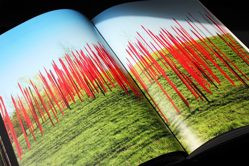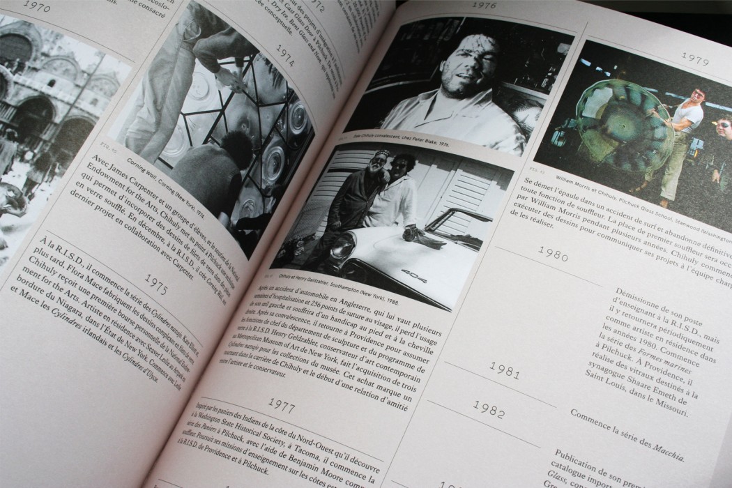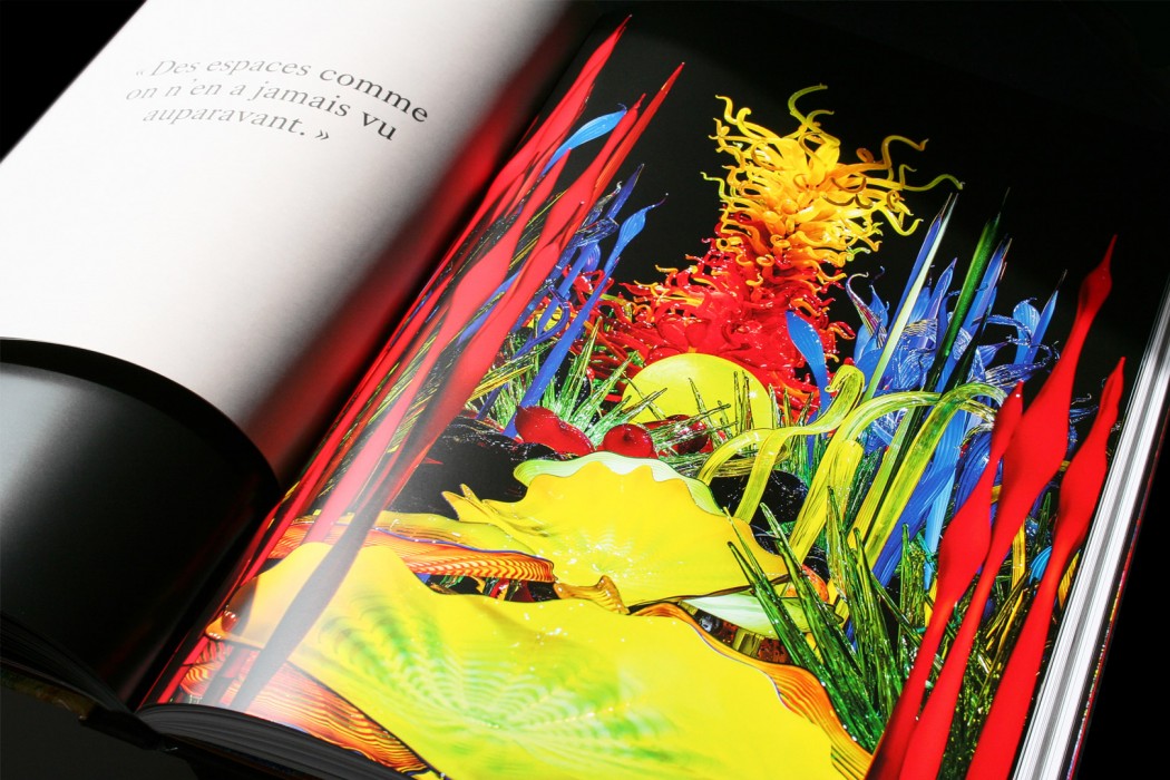 As part of glass artist Dale Chihuly’s exhibition, the Montreal Museum of Fine Arts asked Paprika to design the first French written book dedicated to him. Inspired by his disproportionately sized works, we naturally created a large format book which would do them justice. We were also charmed by his bright colour palette, which we claimed for the flyleaves. A natural rhythm between the portfolio and the informative texts was created thanks to the use of glossy images for the former and of matte paper for the latter. We inserted small-size notebooks to separate sections and describe the context surrounding the work displayed in subsequent pages. Of course, flawless typographic was required to live up to such an ambitions editing project.