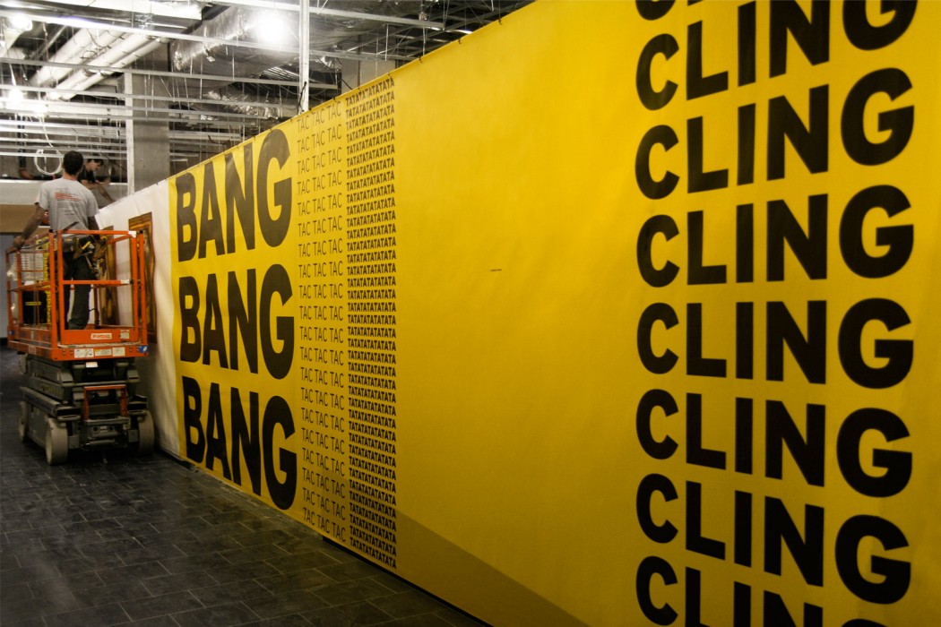 During the renovation works of the Museum of Fine Arts of Montreal, Paprika installed temporary signage entitled “The Museum gets bigger” to conceal the occasional indoor and outdoor inconvenience caused by those major works. By adopting the institutional yellow colour as a sort of visual medium, we made great fences in which three visual concepts matched with each other to create a playful and original environment. We first tempered the MBAM logo by rebuilding it with the help of construction site tape. Moreover, we typographically exploited the onomatopoeia associated with the common noise around renovation works. Finally, we took pleasure in integrating renovation-related elements to the works such as paint cans, safety helmets, and various tools. The installation seems to have pleased the passers-by. Some of them even claimed ownership of a few reproductions!