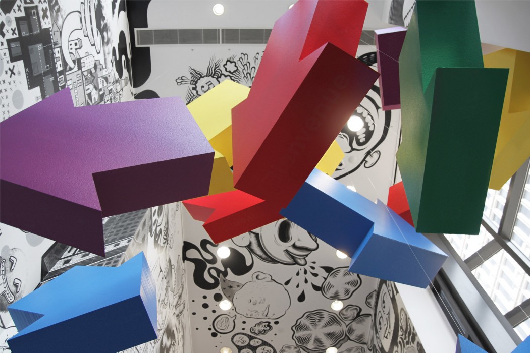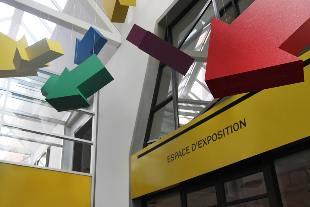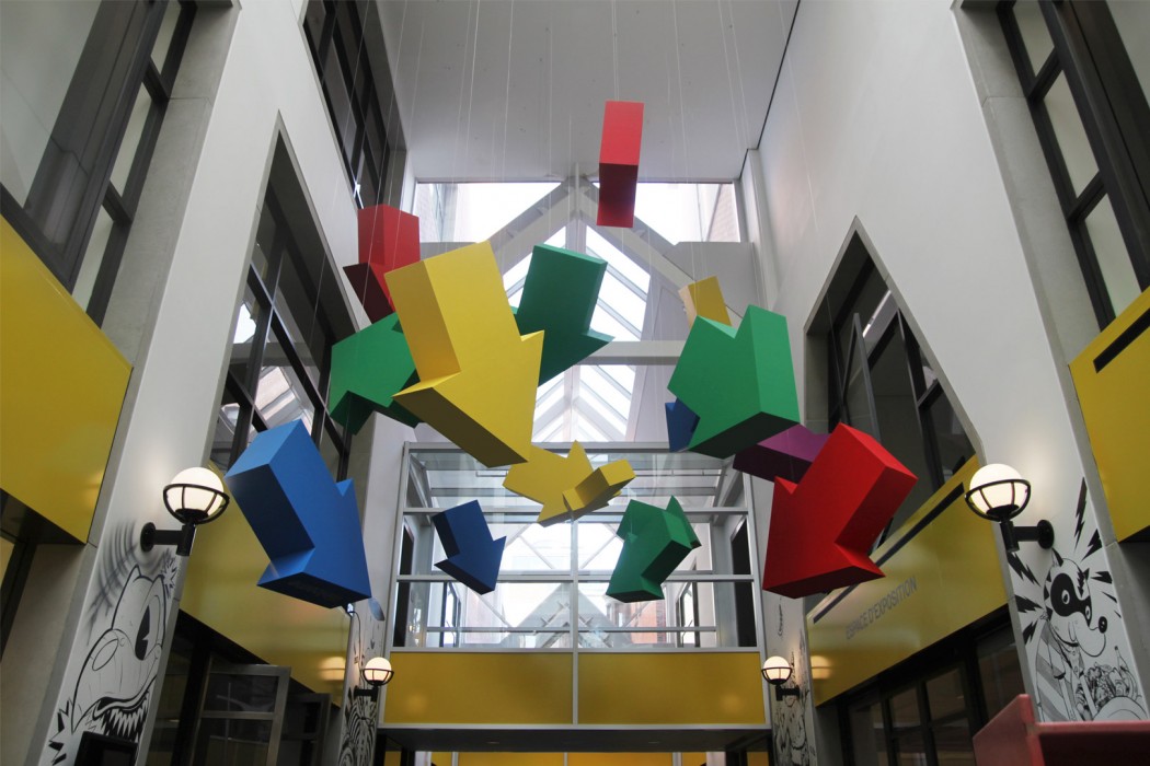 « L’art est partout », voici le message du Musée lorsqu’on entre dans ces espaces éducatifs. Pour concrétiser ce message, nous nous sommes servi d’imposantes flèches 3D de couleurs vives que nous avons suspendues au plafond. Ainsi, la Promenade, porte d’entrée des groupes vers les studios, devient un carrefour fléché incitant les visiteurs à embrasser l’art.