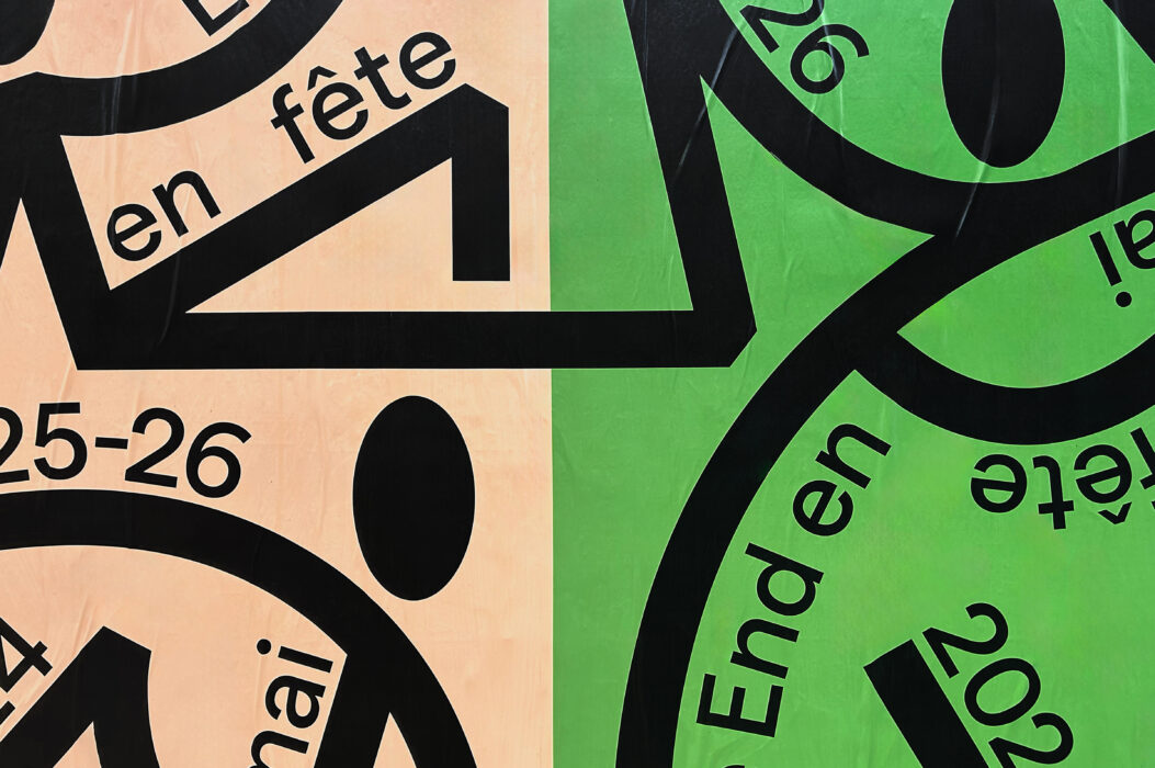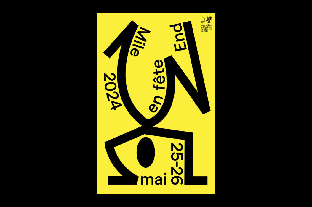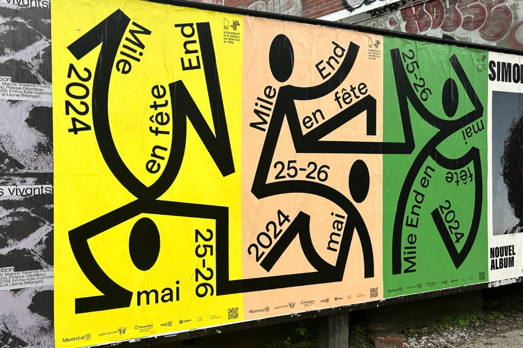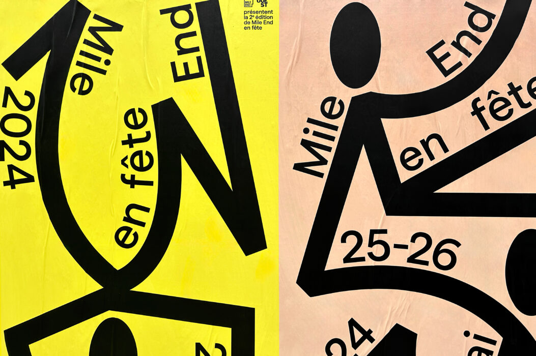 An annual event for Mile End merchants, this second edition of the Mile-End en fête festival features a host of musical, artistic and cultural activities and performances. An initiative of the Mile End Business Association (AGAME) and SDC Laurier Ouest, the festival’s bold itinerary unfolds along a number of arteries, inviting participants to (re)discover the district, its attractions and its retail offering. The lively approach is underpinned by characters in festive poses, sometimes dancing, sometimes lounging. Like its programming in various commercial sectors, the characters are linked together, evoking a cartography of its neighborhoods. Baton typography is used here and there to punctuate the contrasting peach, grass green and lemon yellow posters.