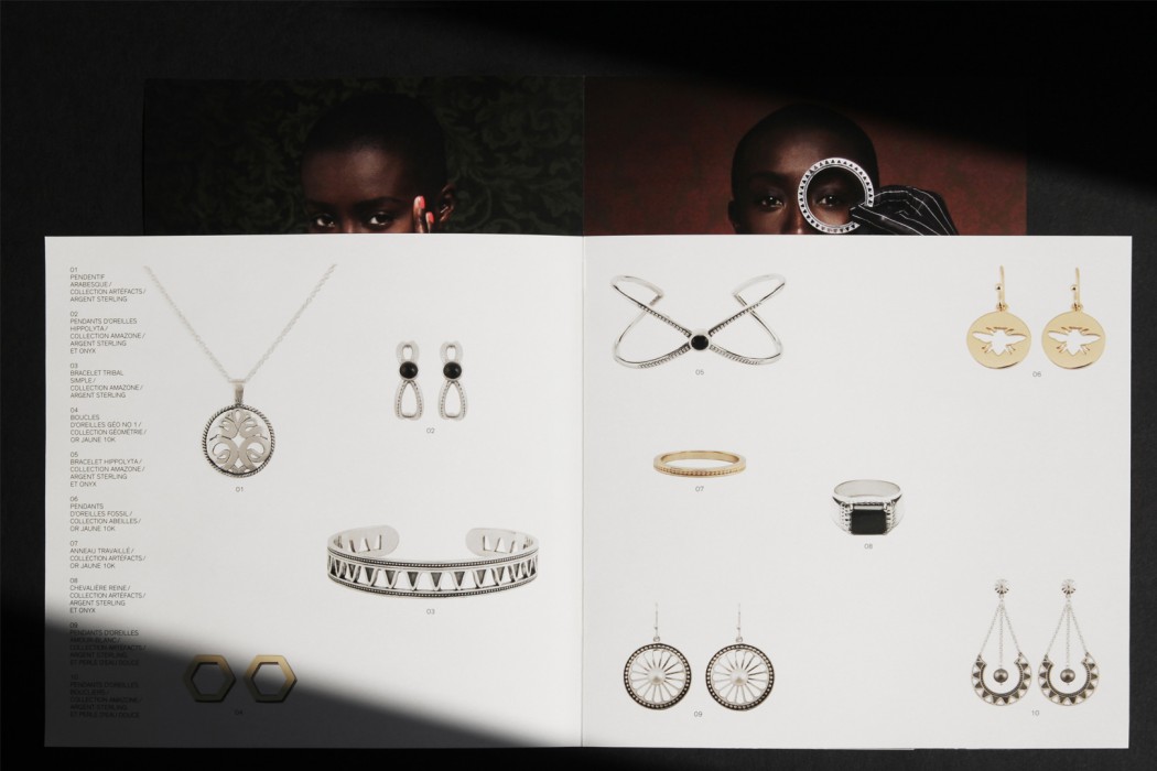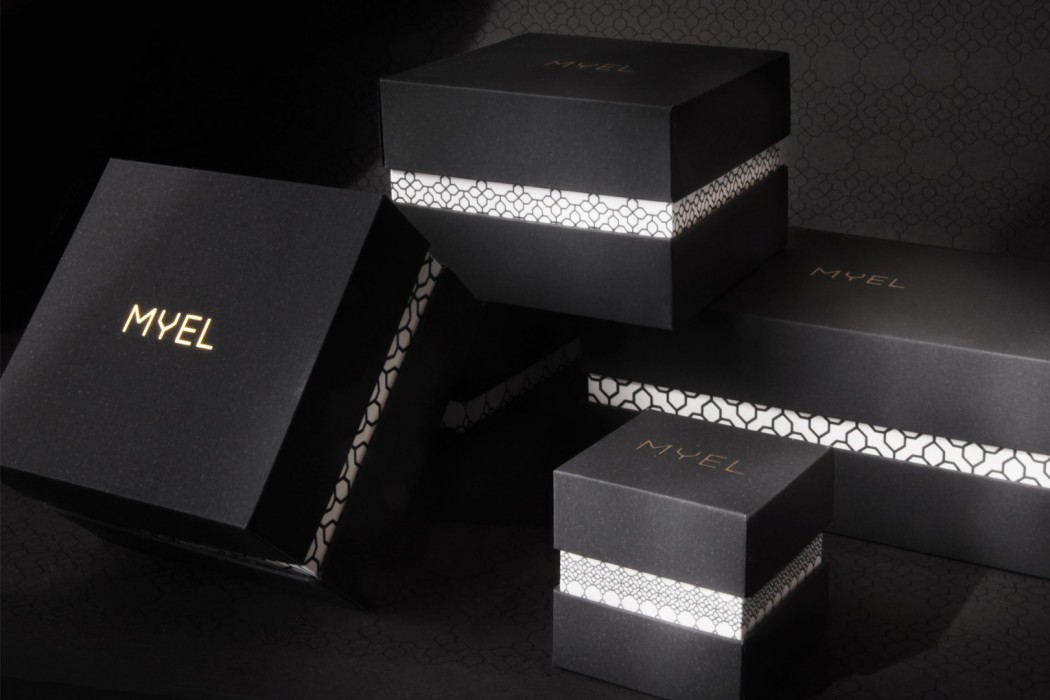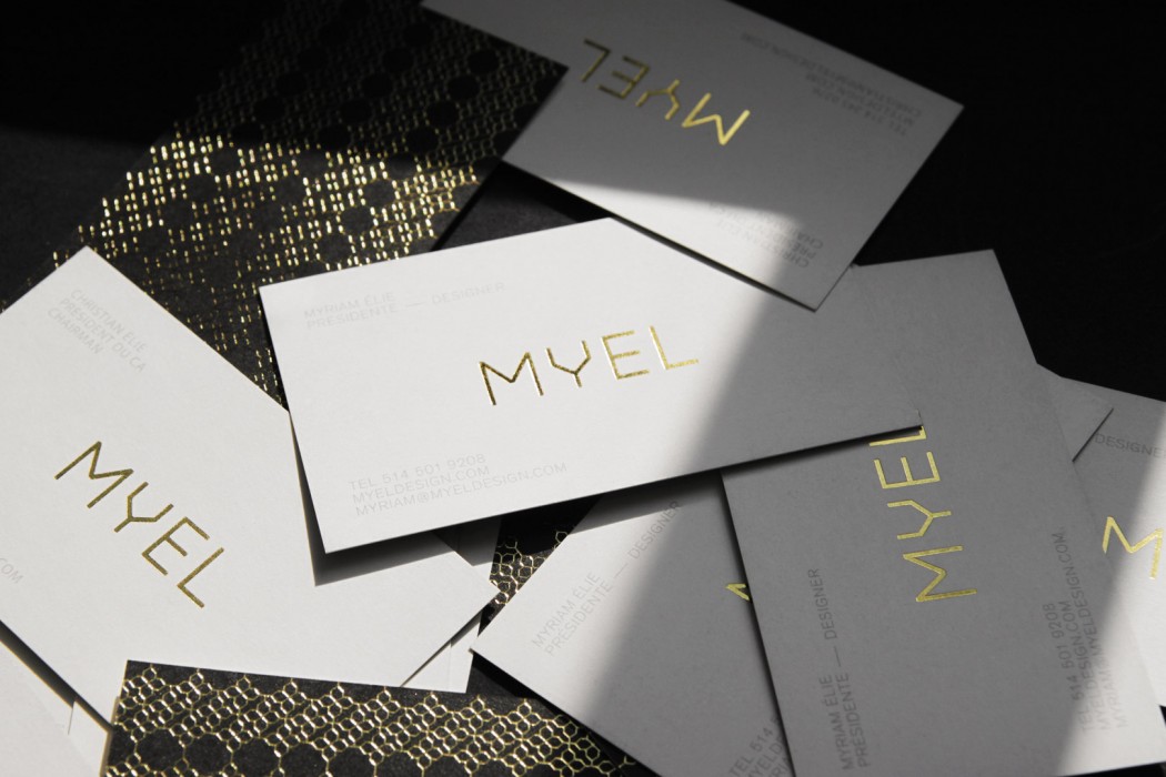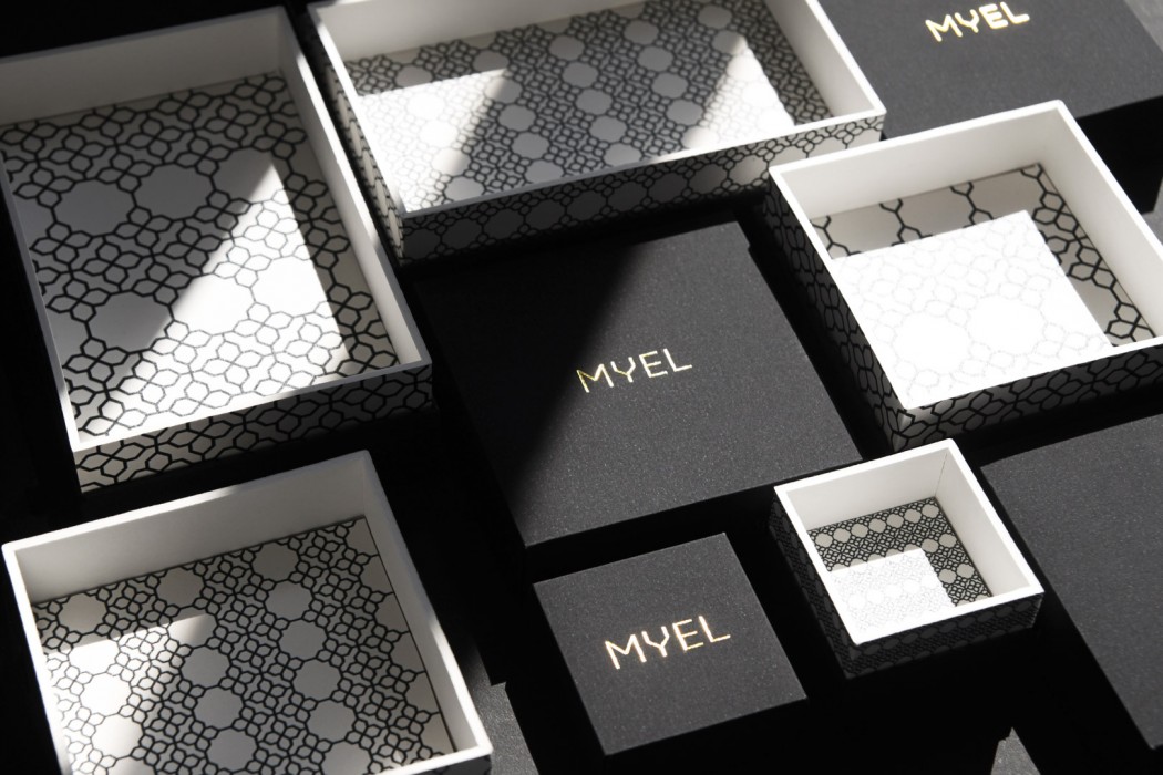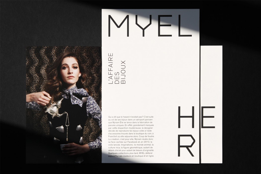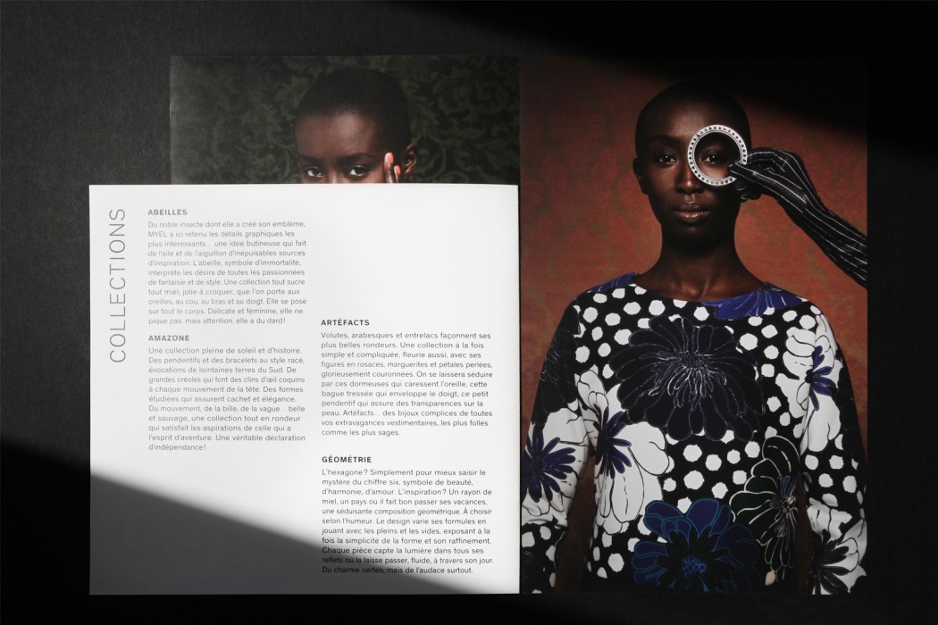 As a jewelry designer, Myriam Élie merges her first name with her surname to call her company Myel. A wink at the name’s tone, honeycombs proved to be a great source of inspiration. Subtly suggested by the “y” in the signature, the honeycomb also manifests itself through a delicate, repetitive pattern. Paprika also suggested the use of gold ink in order to recall the bees’ delicious nectar as well as the fine metals used by the designer to make her jewelry. Given her creations’ delicacy and gracious details, the packaging and the brochure had to be as elegant and delicate.