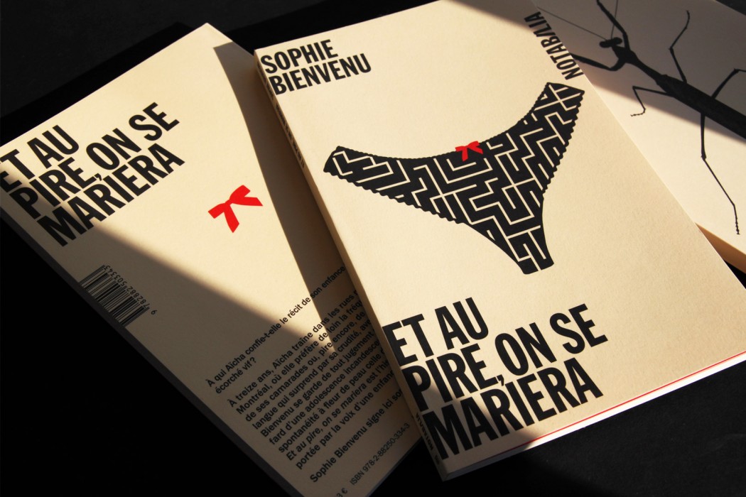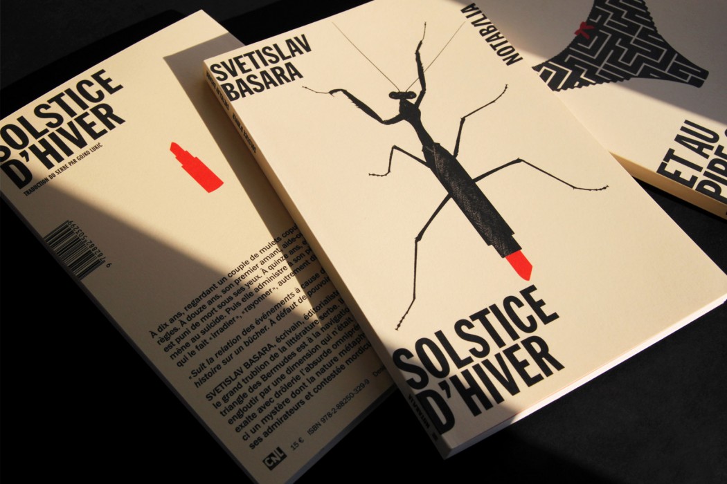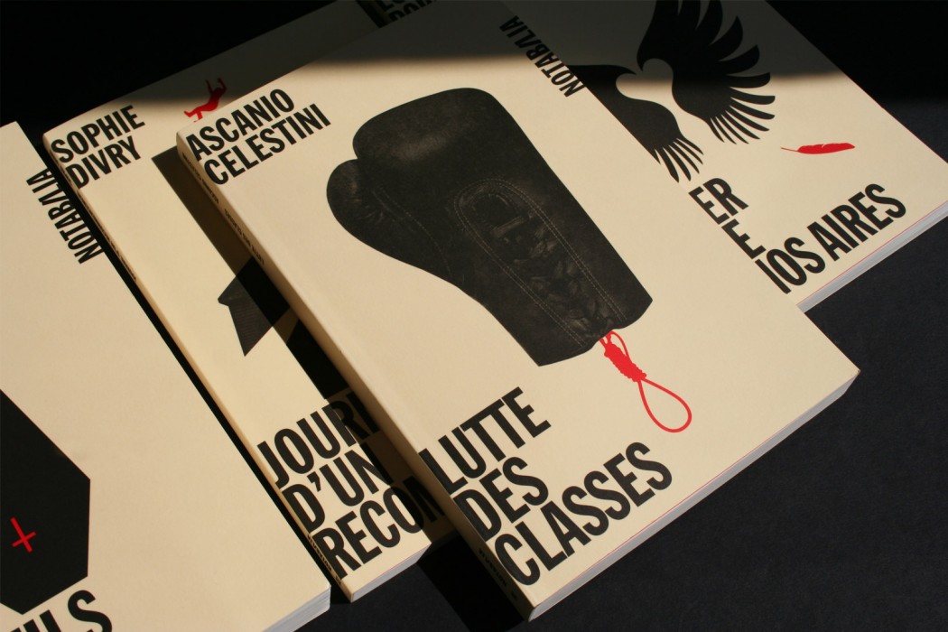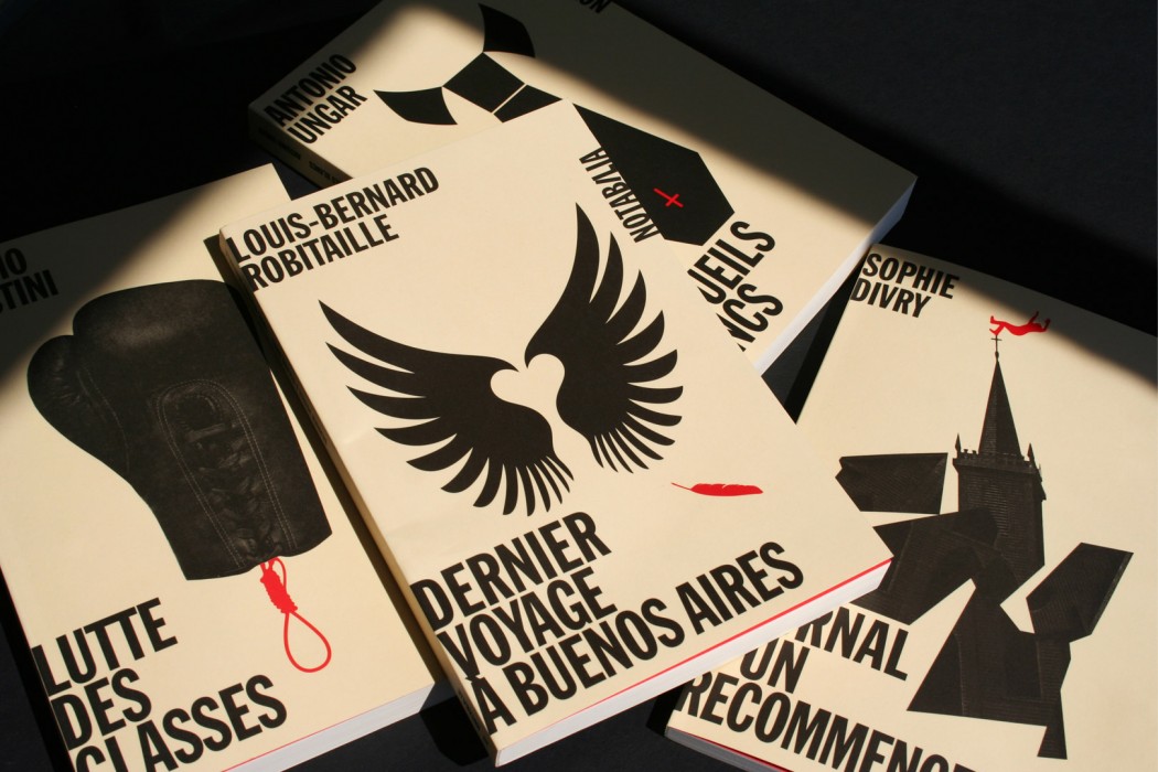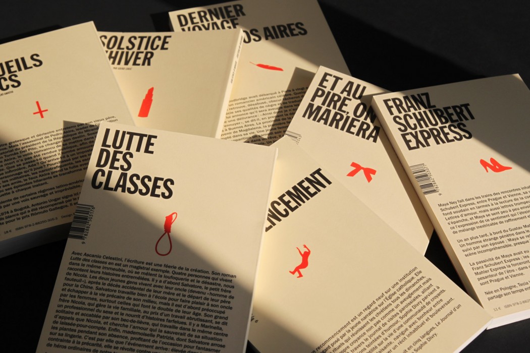 We wanted to create a strong visual identity that would tie the novels together and have an impact in bookstores. To achieve this, we chose a simple cream, black, and lightly red color palette. Visual metaphors composed of various symbols provide hints on the novels’ content. Each illustration unveils a key element of the story which appears on the book’s back. Just like the introduction’s surprising red flyleaves, a simple but powerful typography unites the collection. As for the collection’s signature, we subtly altered the font to suggest books on shelves.