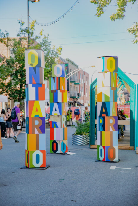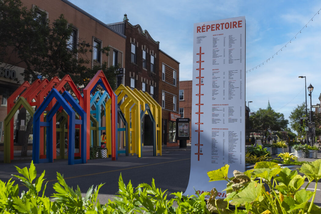 The Ville de Montréal is repeating for a third edition this pedestrianization initiative in the major commercial arteries, the same one that allowed it to be named one of the coolest streets in the world by Time Out. Entitled Ontario en couleur, the Promenade Ontario is adorned with a colourful palette of neighbourhood businesses that personify the diversity of Montreal. This quilted palette is combined with typography inspired by sign lettering. Piles of blocks identify the route, evoking wooden characters and calling out to passers-by as they stroll along, a route punctuated by rest areas. A graphic gesture that is deployed in a multitude of ways, including banners, ground markings, full-size totems and display palisades.