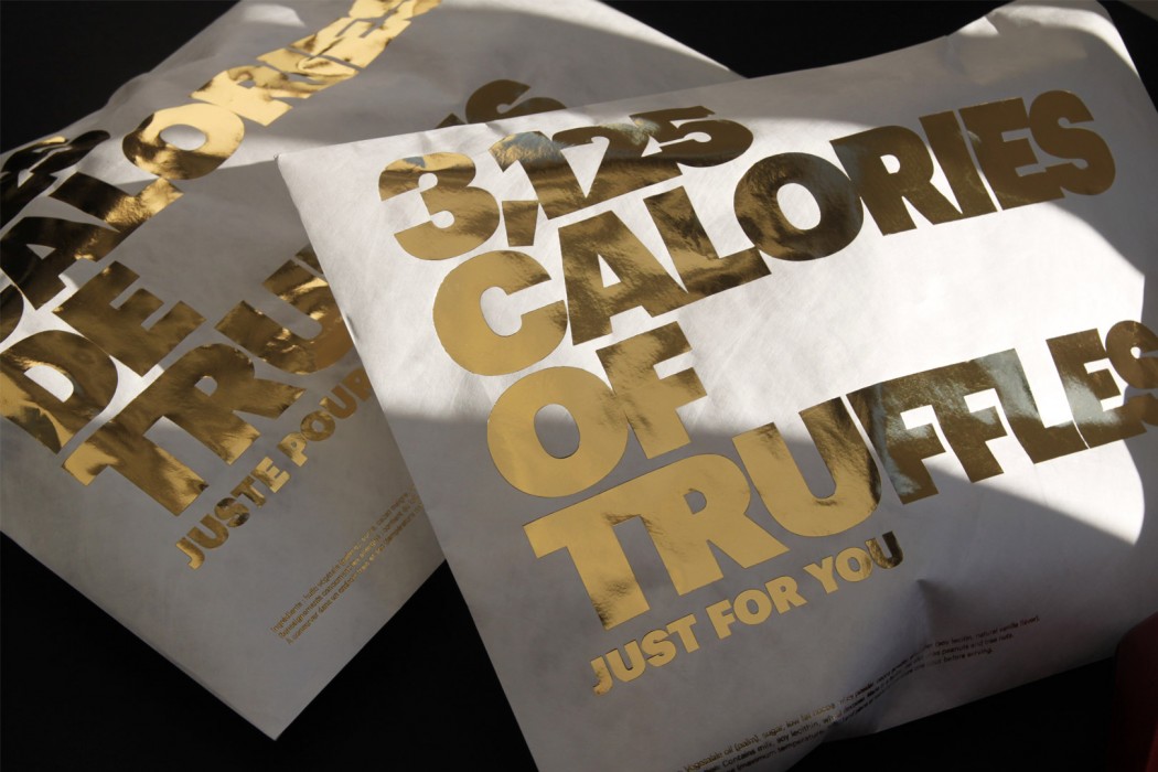 For the holidays, Paprika wished to offer its clients and friends a little something to thank them for their loyalty. The chocolate truffle was our source of inspiration for 2012. Its cocoa texture prompted the creation of an original box made of brown chocolate velvet. To make this packaging unique and show that nothing is sheltered from our imagination, we deliberately twisted it. We played with the theme “More to love” and placed the truffles in a bag marked with the words “3125 calories of truffles” and a ludicrous nutritional value chart.