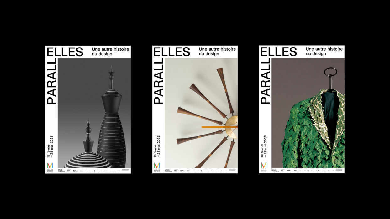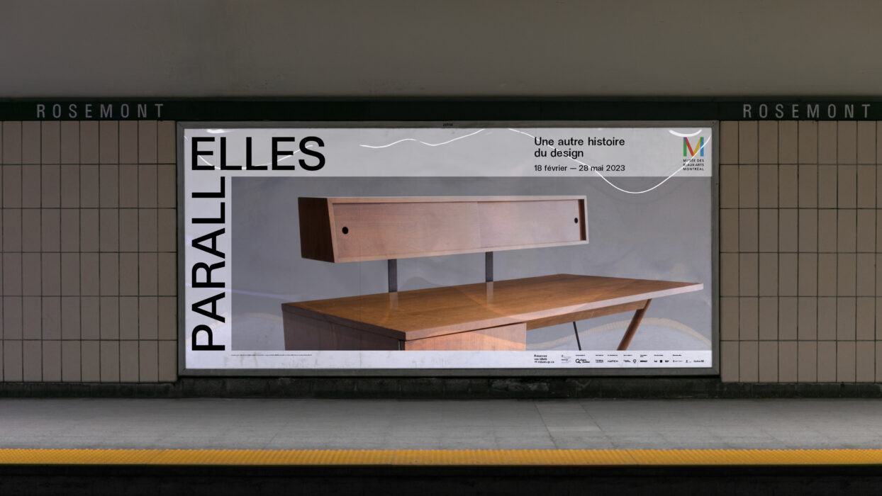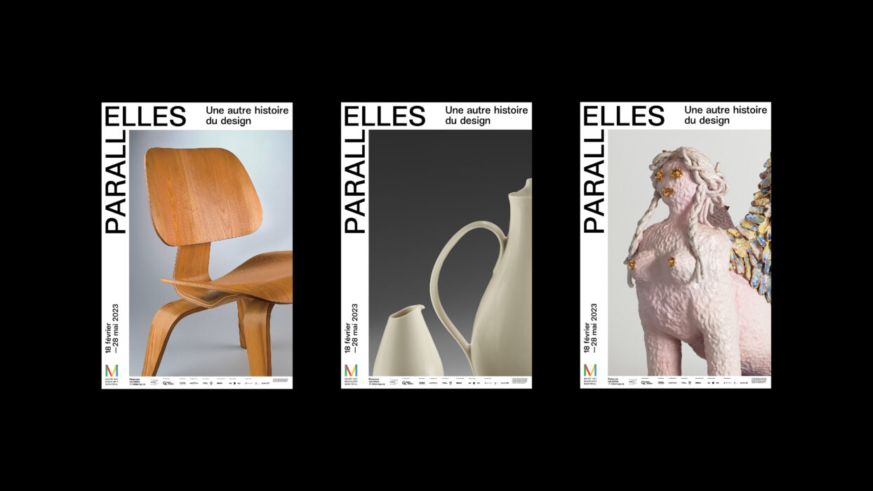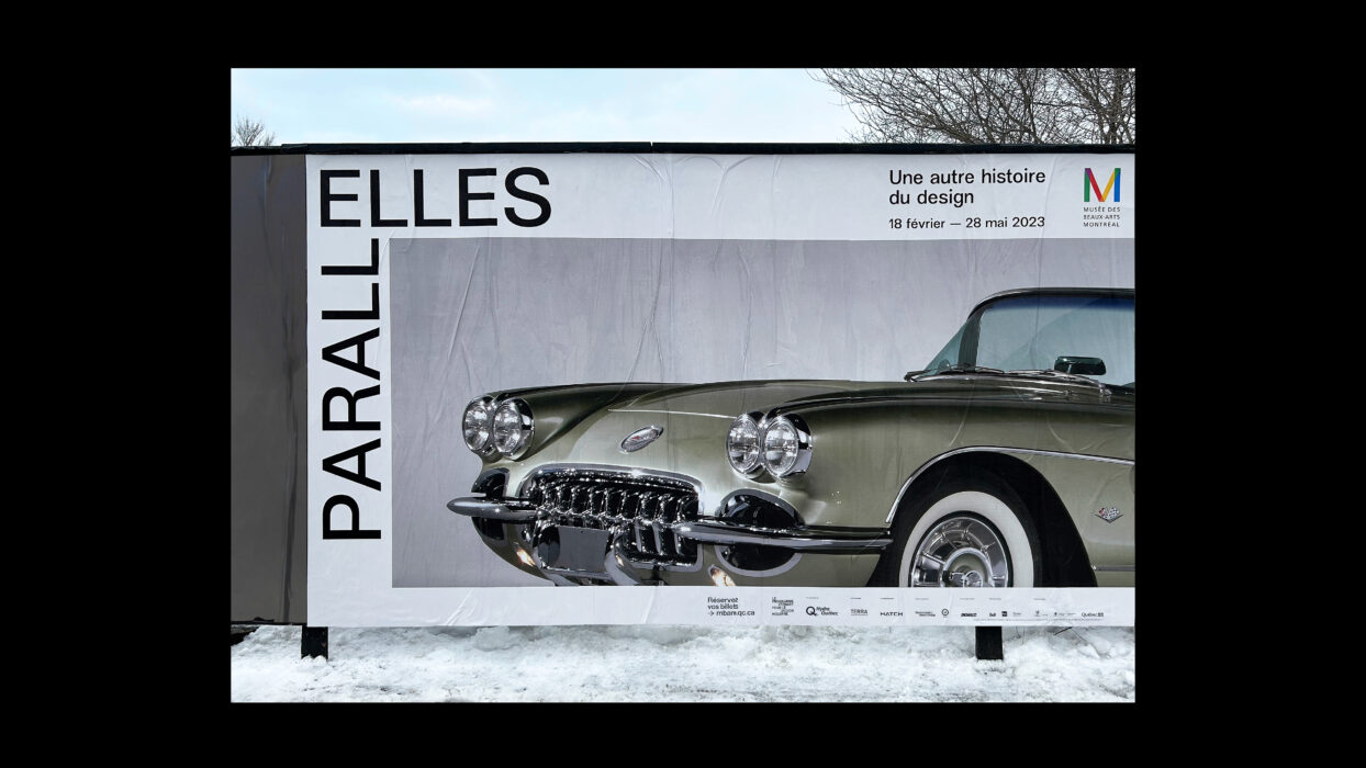 Organisée en collaboration avec le Programme Stewart pour le design moderne, PARALLELLES du Musée des beaux-arts de Montréal est une exposition qui célèbre l’importante contribution des femmes à l’univers du design à travers un riche corpus d’œuvres et d’objets du milieu du XIXe siècle à nos jours. Paprika propose une signature qui présente en exergue les ELLES de cette exposition : un programme de campagne est conçu avec les typographies de Charlotte Rohde le détail d’œuvres d’artistes se déploie en large format. La rutilante Corvette Fancy Free de Ruth Glennie ou encore le Sphinx de Katie Stout prennent d’assaut ce canevas blanc. L’exposition examine les raisons qui ont mené à leur sous-représentation dans l’histoire et propose une réflexion approfondie sur la nature du design.