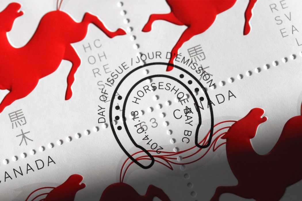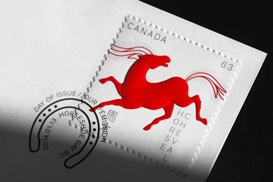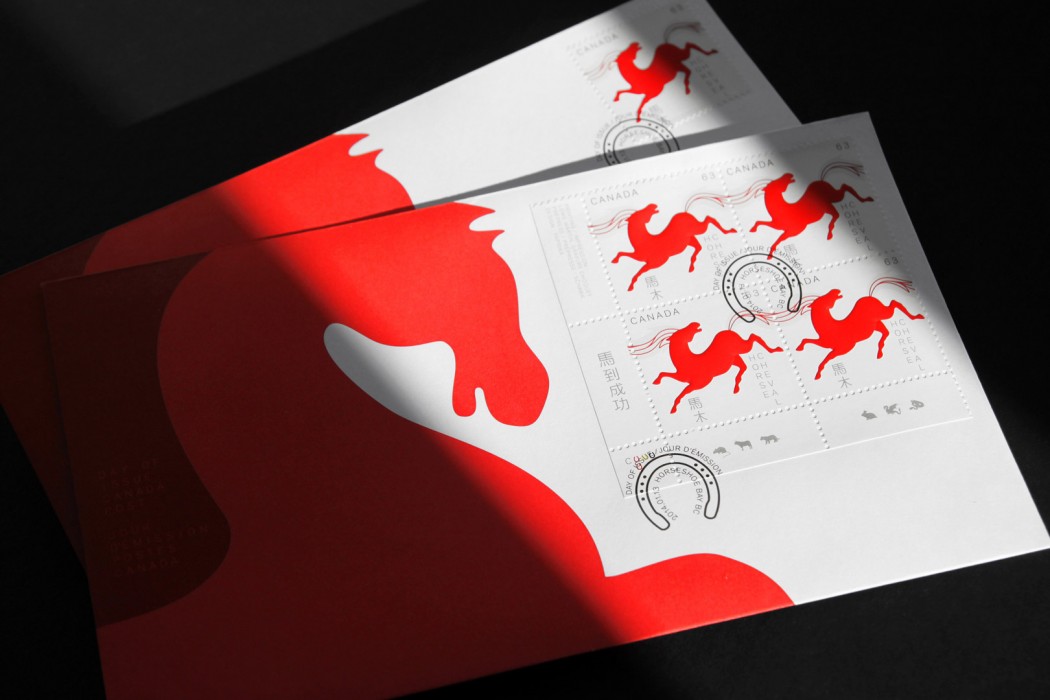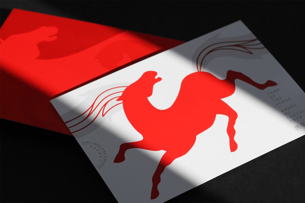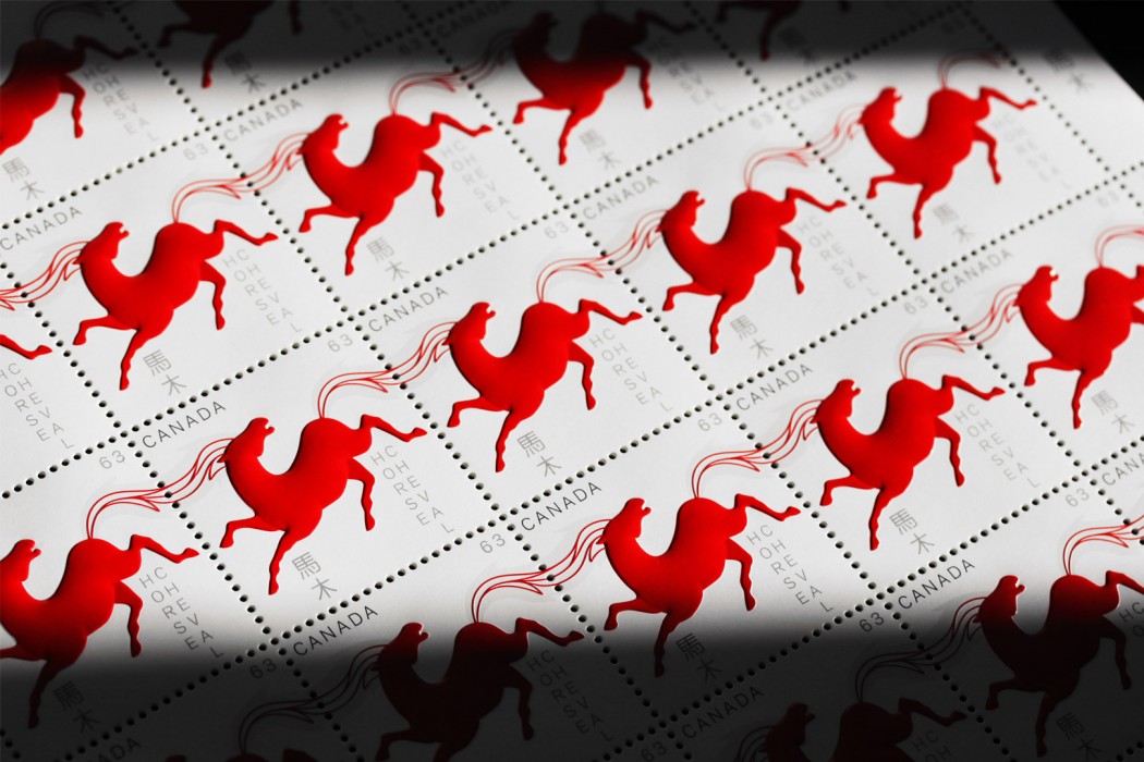 Canada Post wished to celebrate the Lunar New Year by launching a series of stamps dedicated to the year of the Horse. The 12-year-old series is in its sixth edition and is one of the most appreciated of Canada Post’s commemorative postage stamp program. Paprika hoped to keep the public’s passion alive by creating a series that would be up to the precedent editions. In keeping with the great Chinese tradition, we proposed dynamic horses in red and gold to evoke the vigor, strength, and grace specific to horses. The embossing technique gave the horses an additional dimension. For the domestic rate stamp, the animals are presented in motion, their mane and tail connected when they are lined up next to each other. The philatelists loved it!