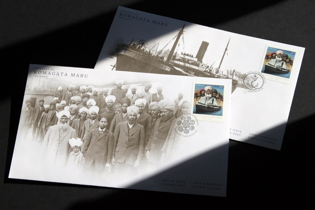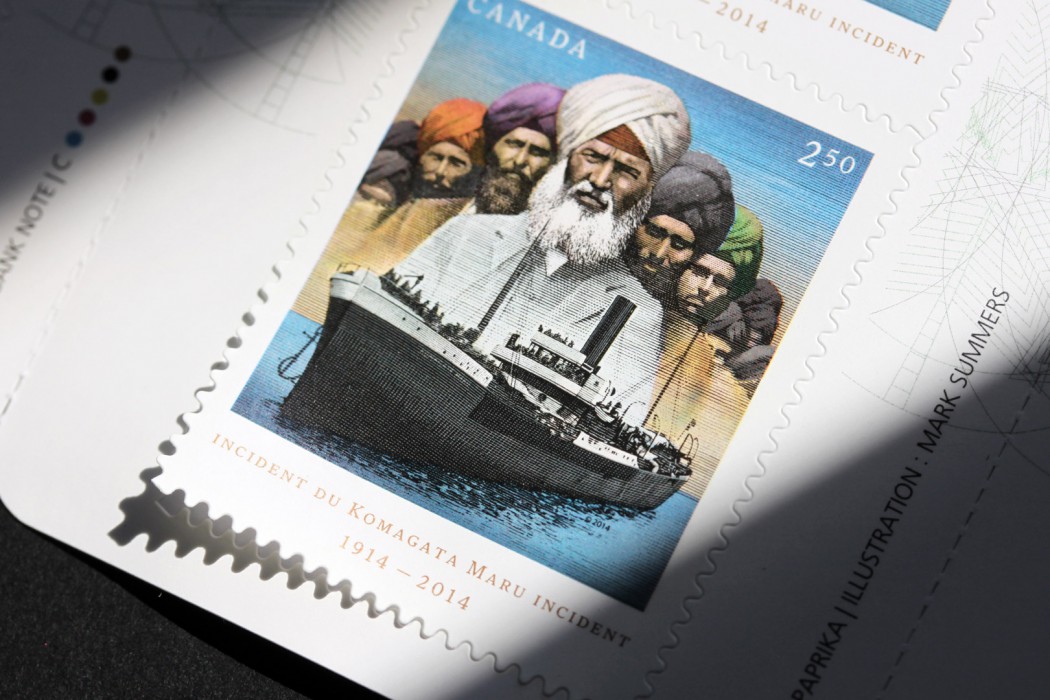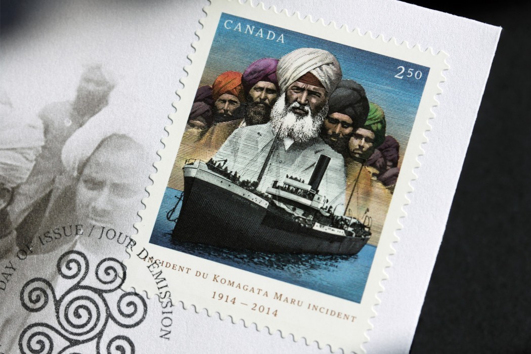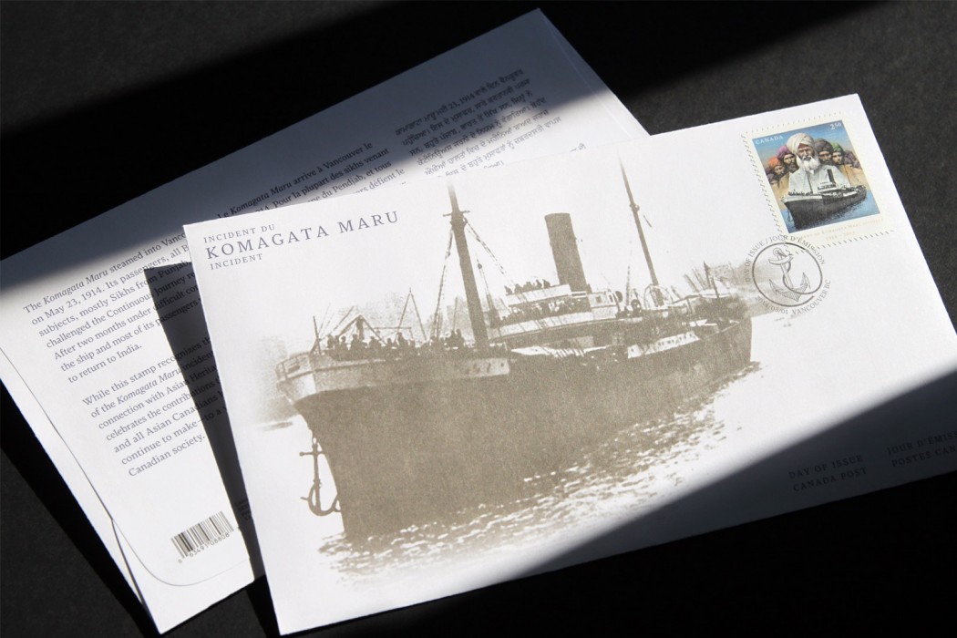 On May 23rd, 1914, the Japanese steamship Komagata Maru arrives in Vancouver’s Burrard Inlet with 376 passengers aboard, most of them Sikh originally from Pendjab in India. Under the terms of the Canadian government’s policy of exclusion, they are prohibited from entering Canada and the steamship is forced to return to India. For the Asian Heritage Month, Canada Post issued a stamp to shed light on this event and show the progress made since then to build a more tolerant and diverse society. To commemorate the incident, we opted for a simple and classic charter. Worthy of freedom and united, the human beings at the heart of this unfortunate incident dominate the image and evoke a ship’s prow. Reproduced with the help of archive images, the illustration made in collaboration with Mark Summers conveys well its historical character by respecting the passengers’ clothing details and the details of the boat arriving on the continent.