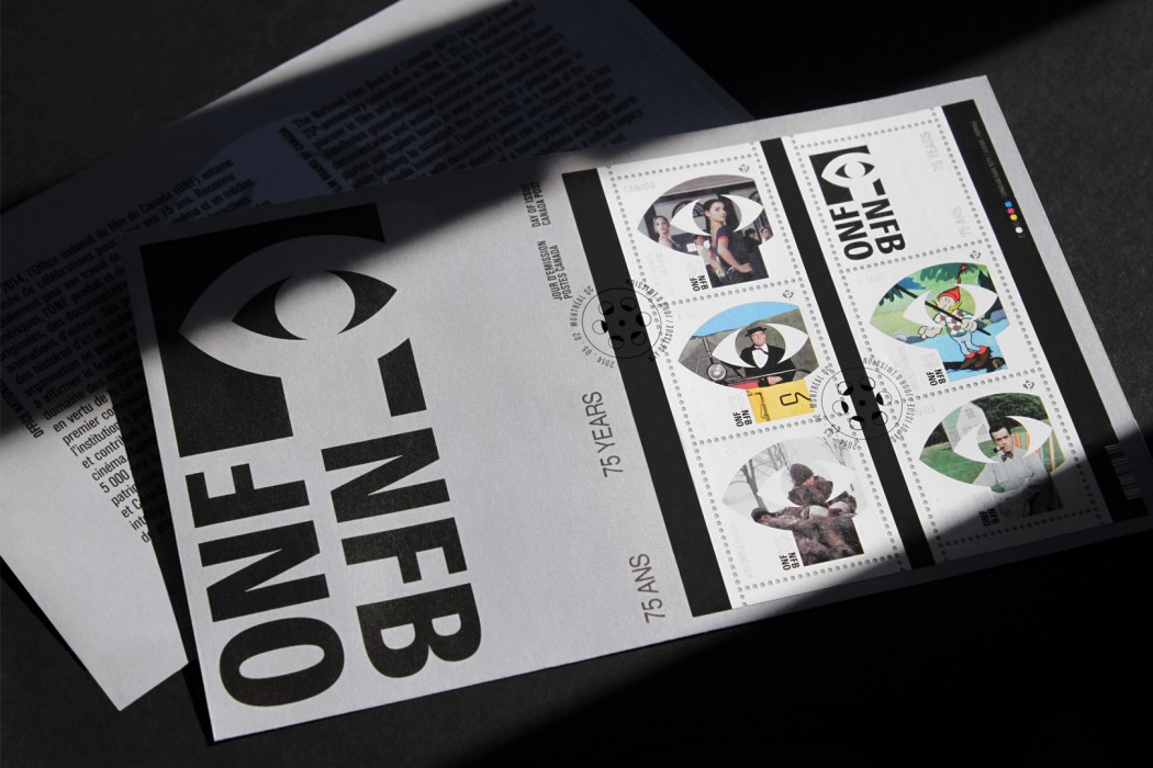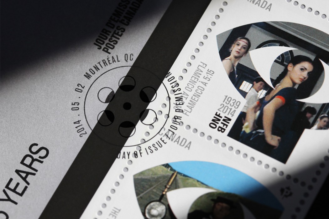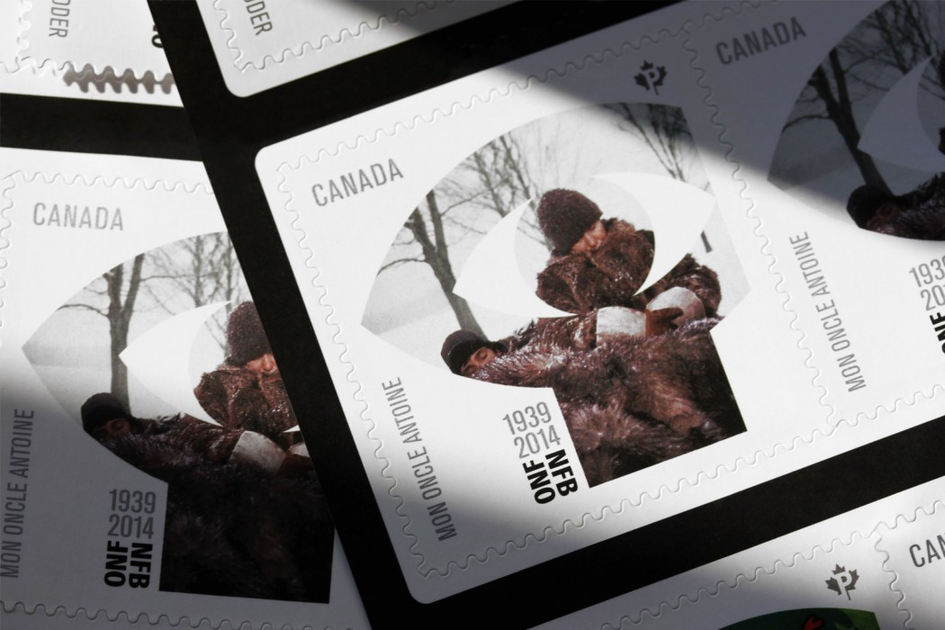 In 2014, to highlight NFB’s 75th anniversary, Canada Post issued five stamps commemorating the exceptional work of this federal agency in charge of putting Canadian realities on film. The stamps designed for the occasion by Paprika feature five works-witnesses of the Canadian repertoire: Flamenco at 5:15, The Railrodder, Mon oncle Antoine, Log Driver’s Waltz, and Neighbors. Each stamp illustrates a movie’s significant scene in form of a NFB logo. Simplicity and impact were required to honor such important works.