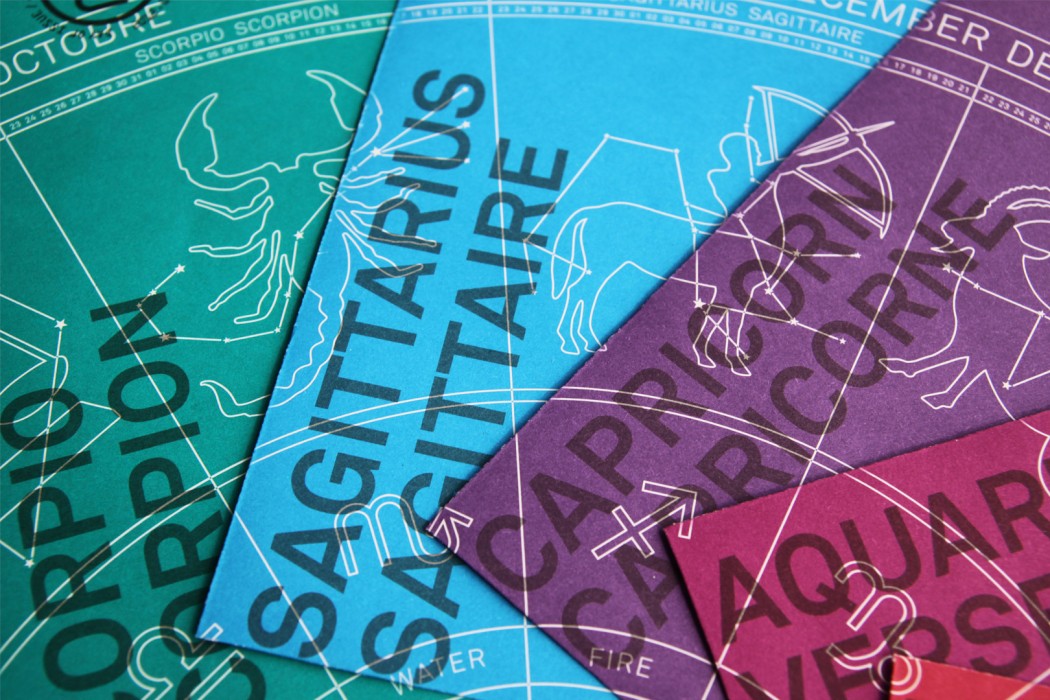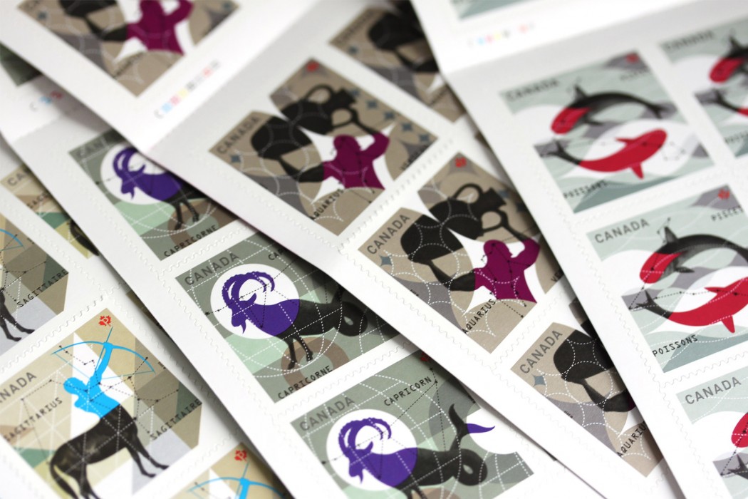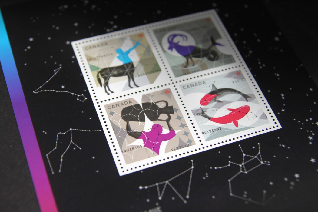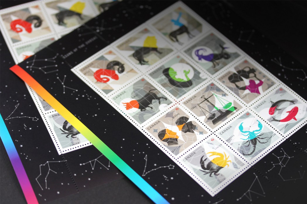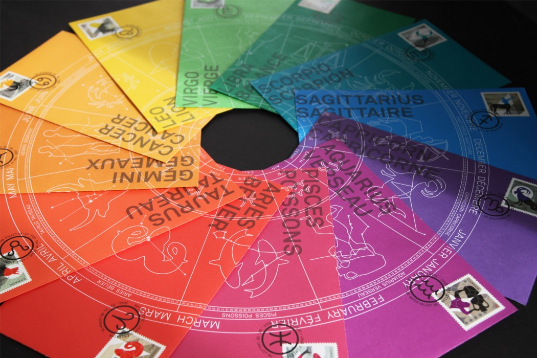 The creation of this Canada Post 12-stamp series on Zodiac signs required rigorous work over a three-year period. Each year, Paprika was commissioned to craft four stamps which were unveiled when it was their respective constellation’s day in the zodiac calendar. Displaying the colors of celestial signs, those stamps illustrated a highly stylized representation of each constellation. The harmony of their graphic unity provided the collection with a wide, interesting perspective. When philatelists got hold of a copy of each version, the superimposition of postage stamp booklets allowed for the creation of an astrological wheel.